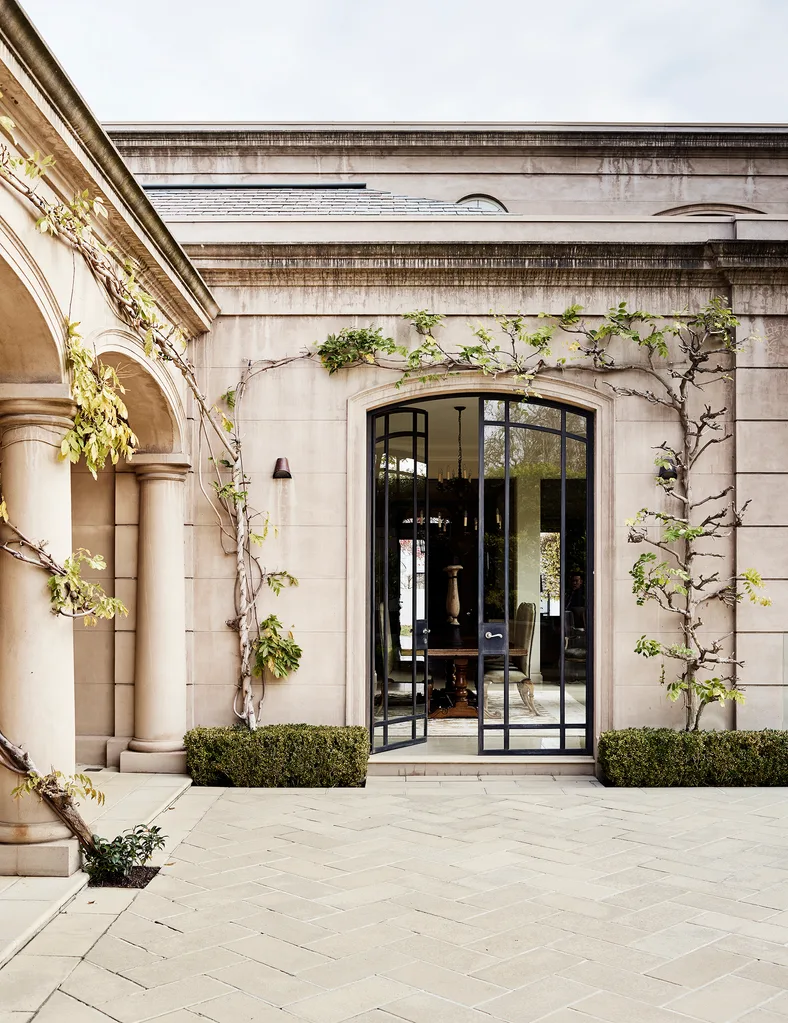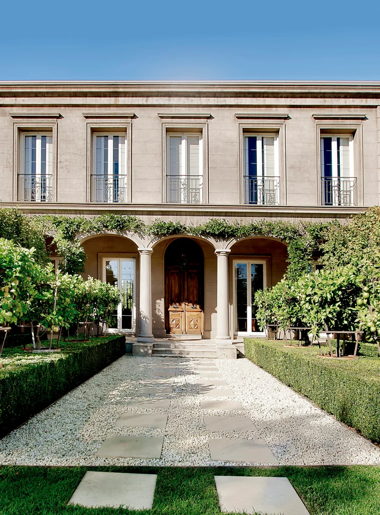 With its pleasing symmetry and balance, the house, unfenced at the front, presents a very inviting face to the street. A gravel-lined forecourt, lined with clipped hedges and an avenue of lemon trees, leads to a deep, arched portico, complete with columns and framed in creepers. “This courtyard creates a sense of arrival and is also a very welcoming gesture for guests, providing protection from the rain and the sun,” says Rob.