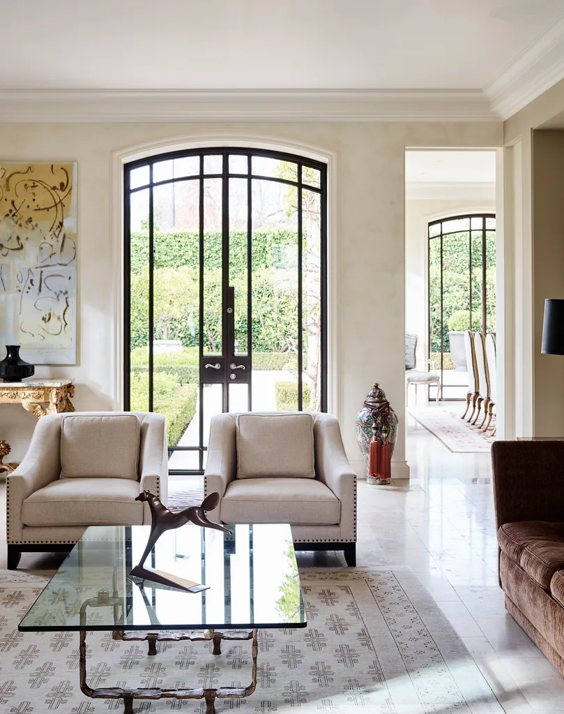 Antique double doors for the entrance were sourced in Italy, and their extreme height called for the ceiling in the entrance to be arched, an alteration to the original plan. Their aged patina and generous proportions set the tone for the grandeur that prevails inside.