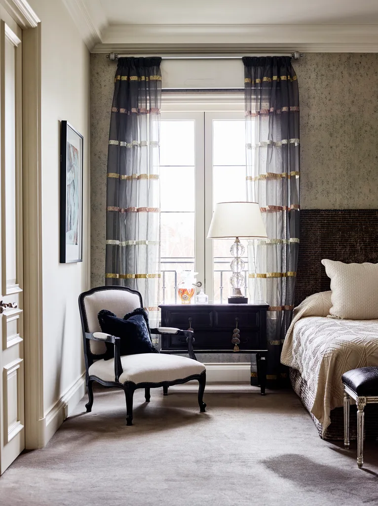 Custom-upholstered bedhead. Bedside table, Cromwell. Perfume bottle, Lalique for Nina Ricci. Louis XV armchair, Graham Geddes Antiques.