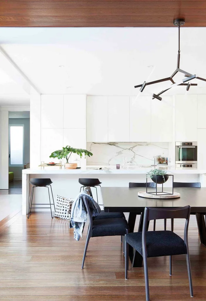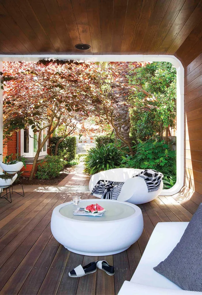 A thoroughly modern open-plan living and eating addition is arranged in an L-shape around a gleaming white kitchen. Everything looks towards that gorgeous outdoor space; to connect the inside of the home with the outdoors, oak ceilings line both the cabana and adjoining dining room. With their easy living style, it’s obvious all the spaces echo and embrace the couple’s passion for entertaining.”We host friends and family regularly,” says Laura.
