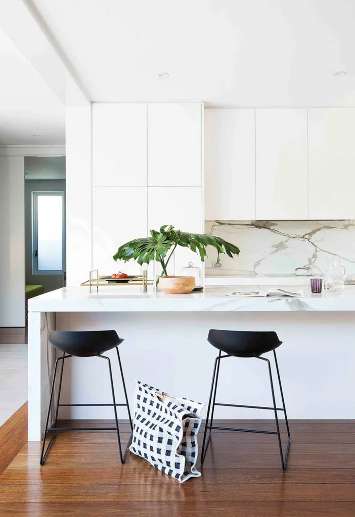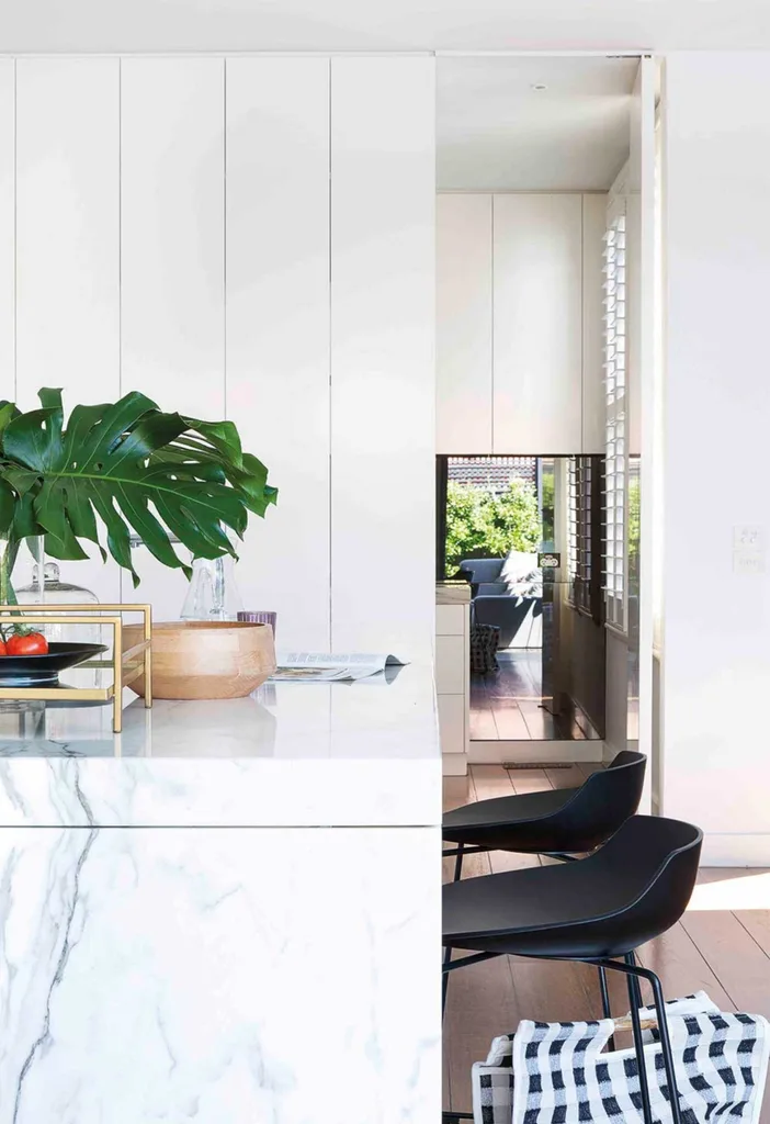 “We were after a clean, elegant look,” says Joe of the family’s elegant kitchen, which features swathes of marble and practical 2-pac cabinetry. “The island bench is a central element of the whole space and a lot of work went into the detailing and finish, particularly ensuring that the grain of the marble matched perfectly.”