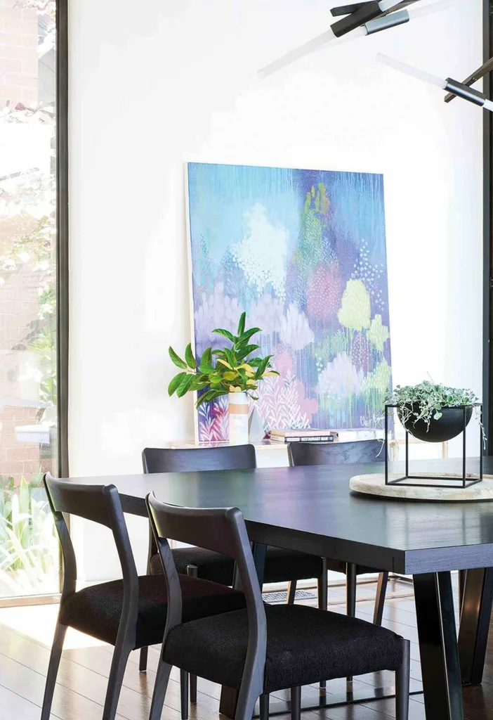 Sitting down for a meal is extremely flexible in the dining zone, which works equally as well for a quiet weekday family dinner as for when summer fiestas see the doors to the curved cabana open up. “The custom-made table is really special for us,” says Laura. “We had it built to fit the space. Its square shape is deliberate to encourage a sense of togetherness and conversation.” The table is extendable, so it can easily accommodate a crowd. A piece by local artist Clair Bremner adds a splash of colour.