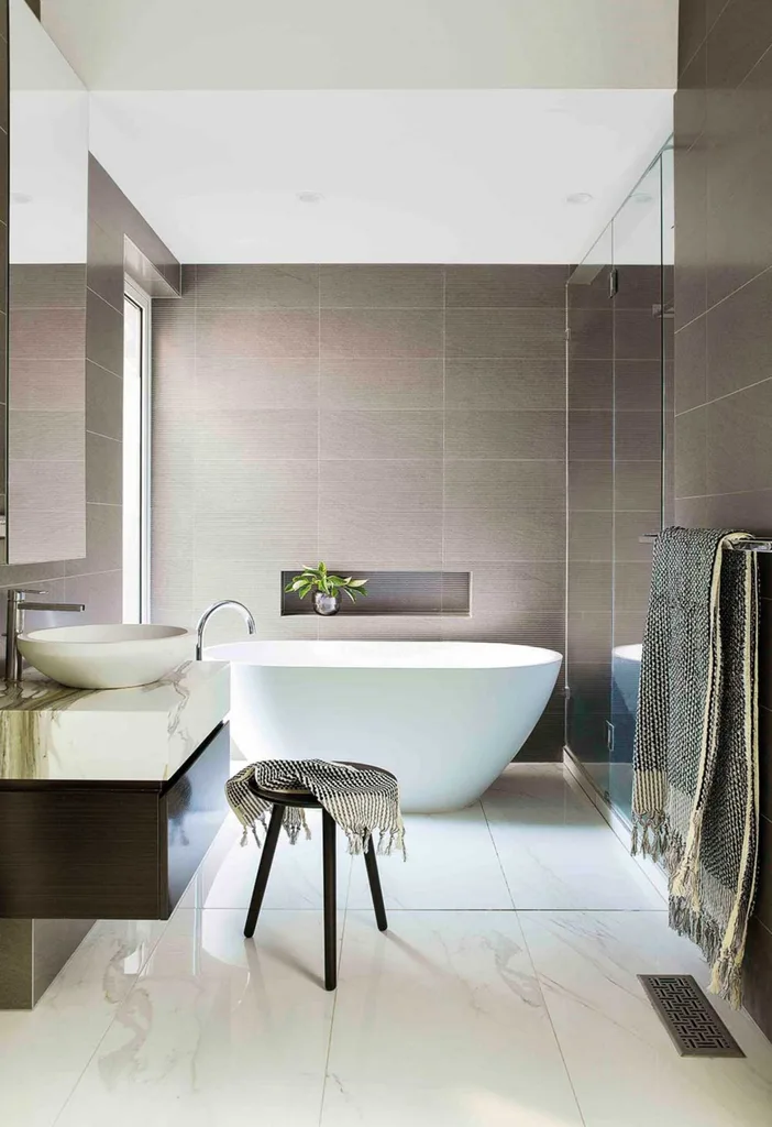 In the ensuite, natural light from a floor-to-ceiling frosted glass window washes over the curved ‘Emily’ freestanding tub by Dado, elegantly offset by a rectilinear display and storage shelf. These form the statement visuals of a no-holds-barred ensuite complete with cutting-edge fittings and tapware, including a ‘Sussex Scala’ floor-mounted spout, available at Reece. A floating sink unit with basin, also by Dado, echoes the rounded silhouette of the bath.