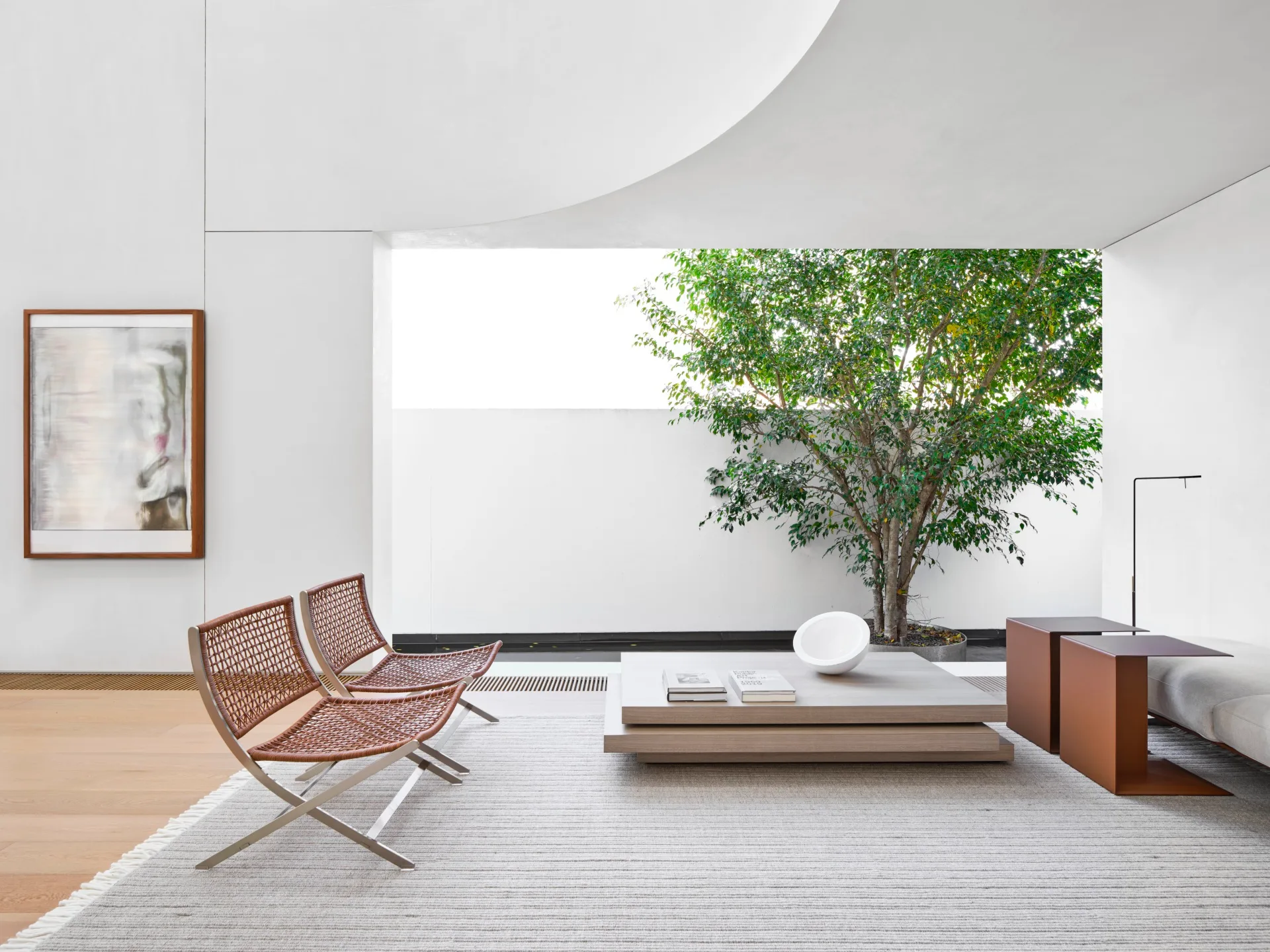 The wonderfully light and airy family room is furnished simply with Flexform ‘Peter’ chairs, ‘Campiello’ sofa and ‘Plain’ side tables, all from Fanuli with a custom coffee table by Smart Design Studio on a Maxalto ‘Timo’ rug. When Objects Work ‘John Pawson’ bowl from Hub. Viabizzuno ‘Roy’ standing lamp from VBO. Artwork is Study for a Mirror by Coen Young. The single tree provides a link to the outdoors along with the black granite pond that connects with the pool at the back of the contemporary addition.