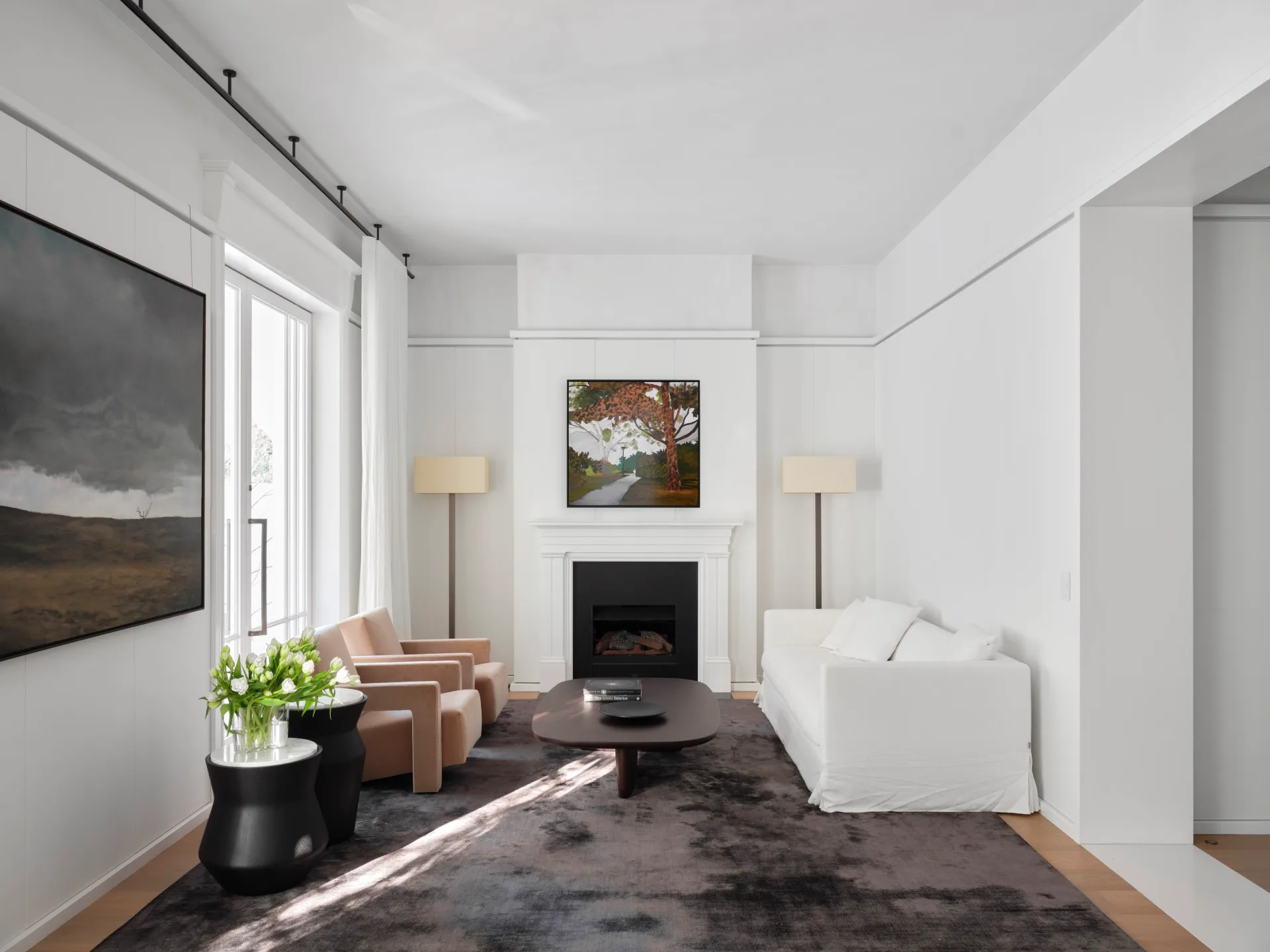 The formal living room is furnished with Cassina ‘Utrecht’ armchairs from Est Living, a Maxalto ‘Simpliciter’ sofa, ‘Leukon’ floor lamps and B&B Italia ‘Tobi-Ishi’ coffee table from Space on a rug from Whitecliffe Imports. Gallotti&Radice ‘Dama’ side tables. Painting 218 (The Domain) by Alan Jones hangs above the fireplace. Artwork on side wall by James King.