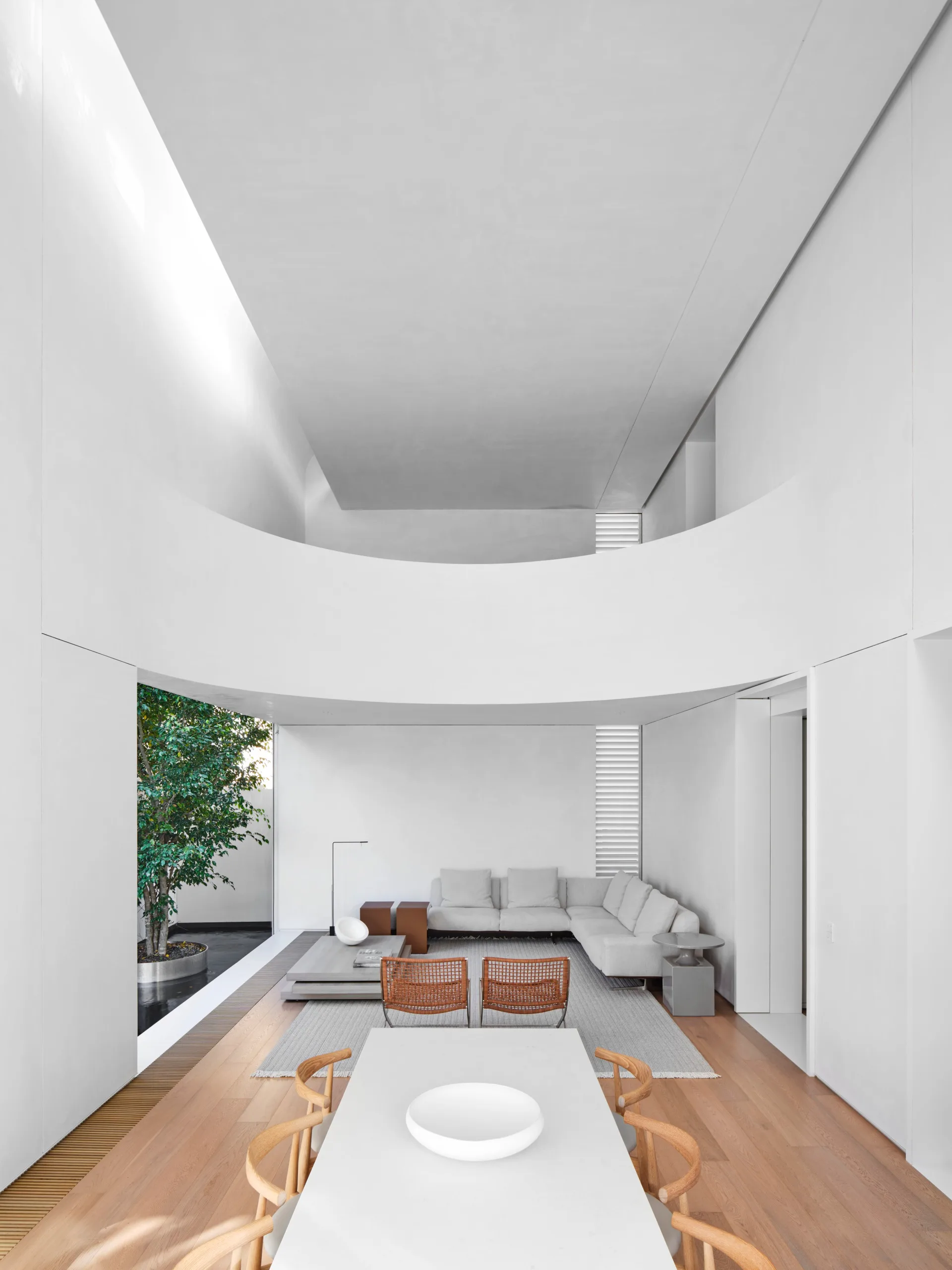 Here, light bounces around the room thanks to the reflective nature of the waxed render on the walls and the sweeping curve of the mezzanine as well as the judicious placement of a tall slot window on one side of the house and a long clerestory window.