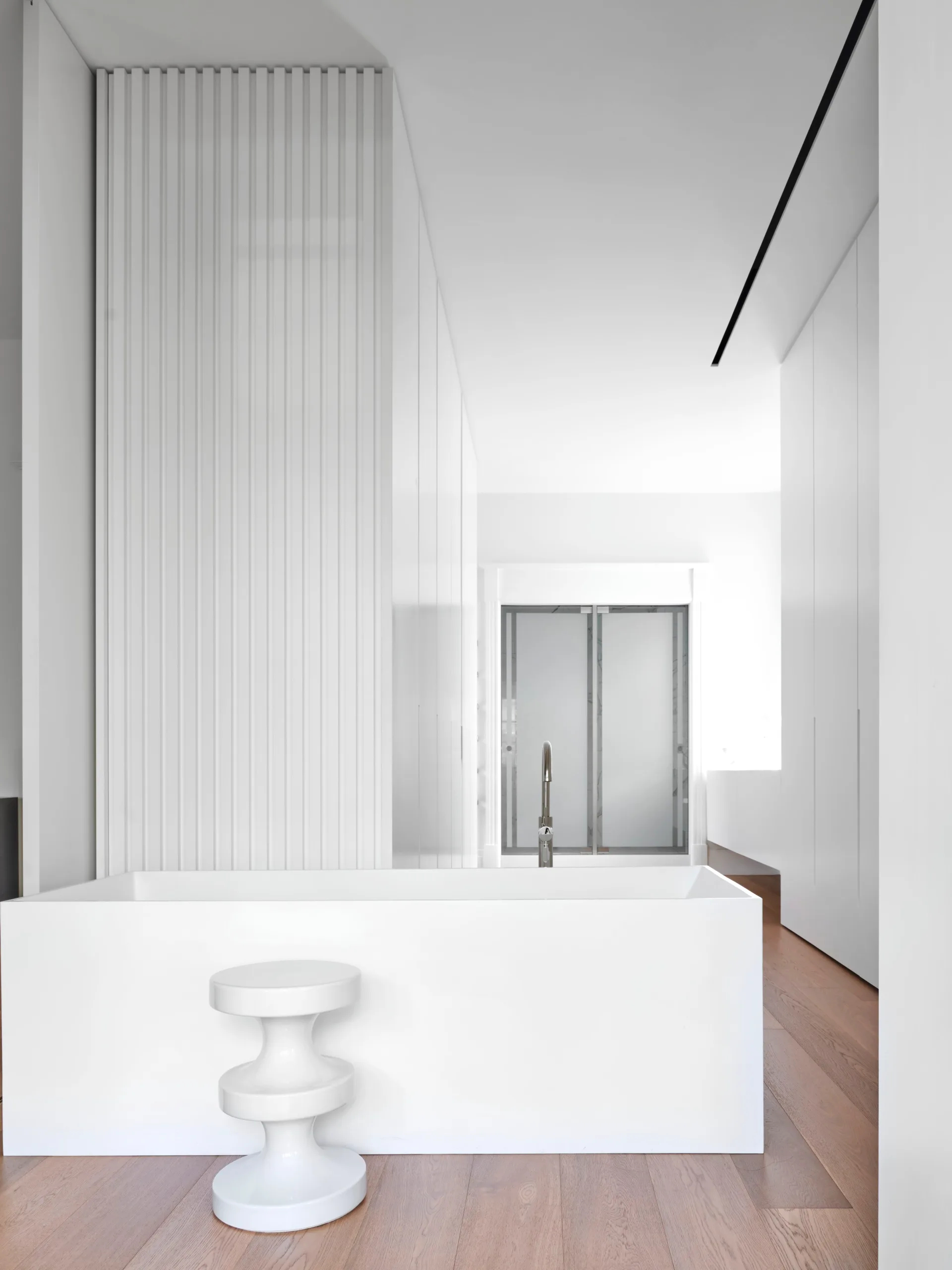 The main bedroom ensuite is cool and calm. ‘Becco’ freestanding rectangular stone bath from Prodigg. India Mahdavi ‘Bishop’ stool from Studio ALM. Brodware ‘Minim’ tapware in polished nickel from Candana.