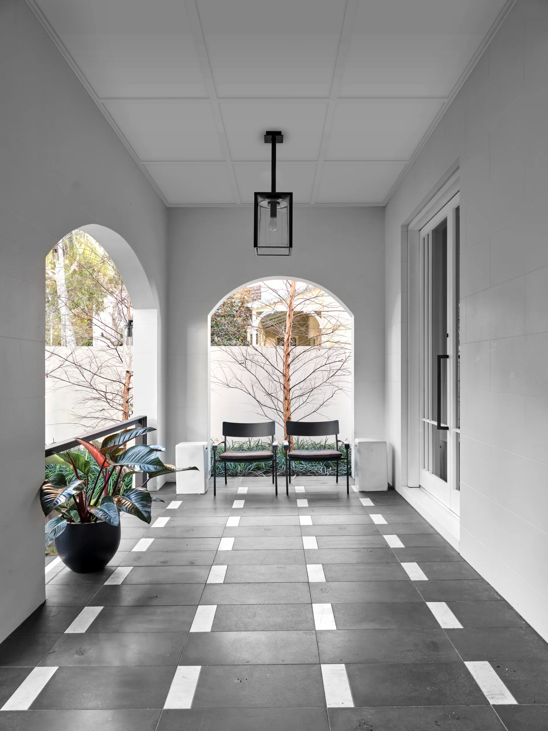 Vincent van Duysen for Serax ‘August’ chairs from Ondene and Gervasoni Inout side tables from Anibou in the portico. Royal Botania ‘Dome’ pendant lamp from LightCo. Flooring in bluestone pavers from Bamstone with Carrara marble inserts.