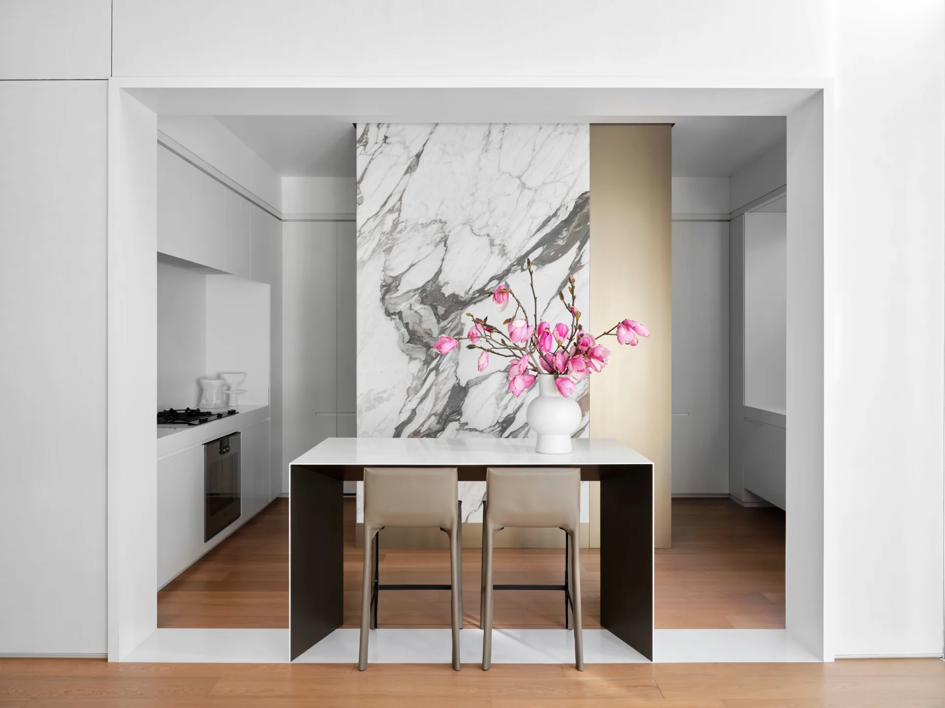The kitchen has a spectacular backdrop wall in Calacatta Vagli marble from Worldstone that echoes an artwork by Victoria Hempstead on the opposite wall. Walter Knoll ‘Saddle’ barstools in Khaki from Living Edge. Rina Menardi ‘Princess’ vessel from Ondene.