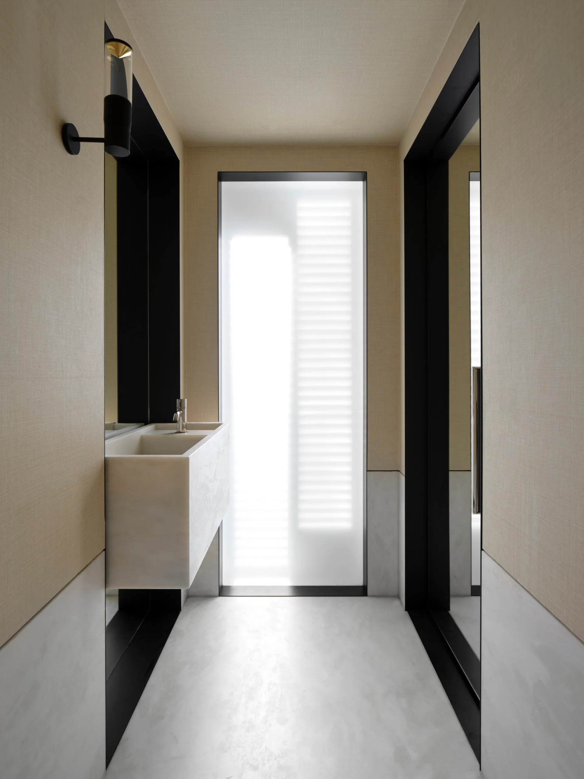 In the powder room a custom Corian basin with Brodware ‘Minim’ tapware in polished nickel from Candana. Viabizzuno ‘Royal Parete’ wall light from VBO.