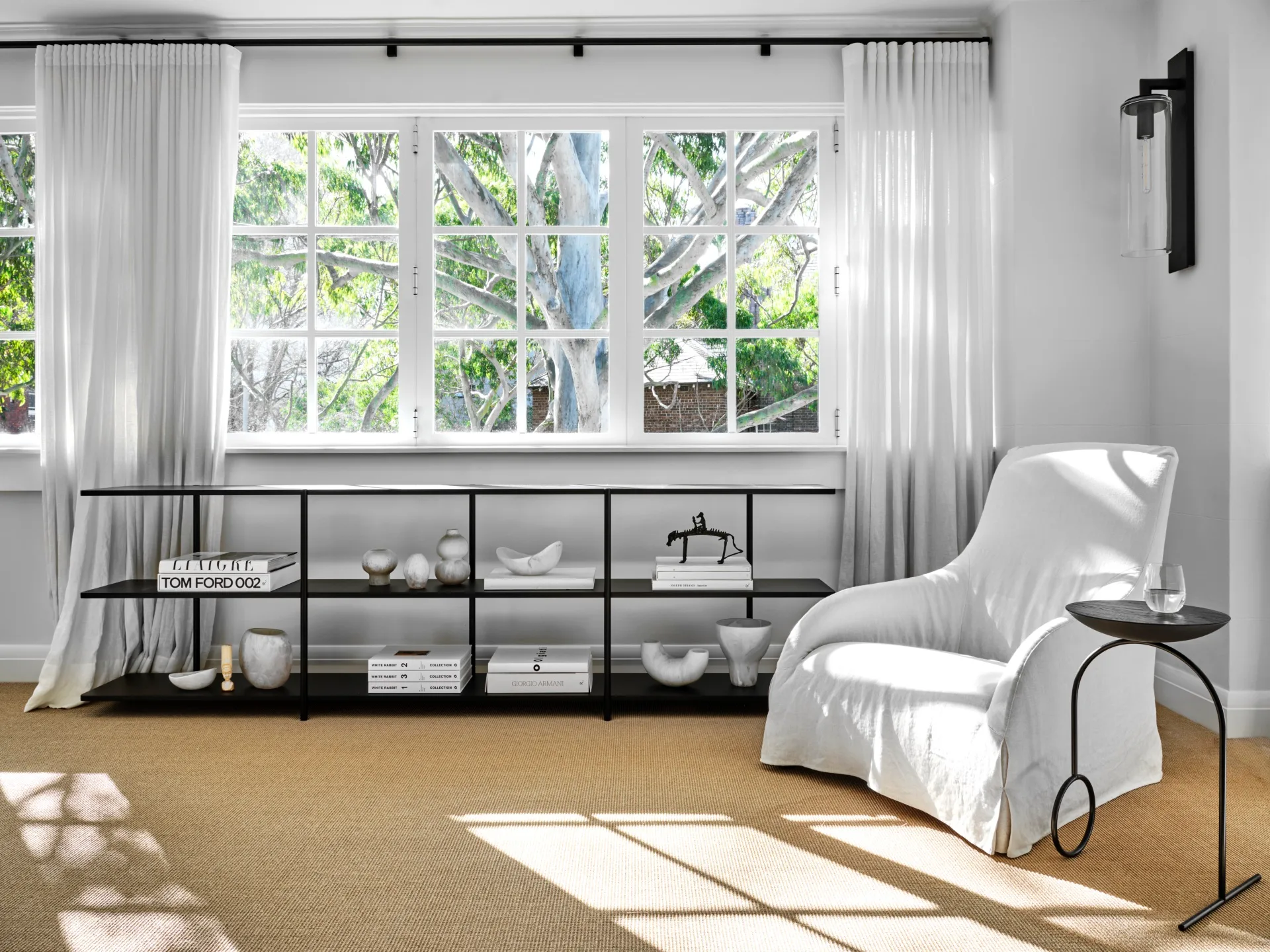 Patterns of light in the sunroom with its multi-paned windows dressed with Maison Collection ‘Kobi’ linen curtains in Chalk from Homelife Furnishings. Living Divani ‘Aero’ shelves and Maxalto ‘Kalos’ armchair both from Space with Viccarbe ‘Giro’ side table from Hub. Royal Botania ‘Dome’ wall light from LightCo.
