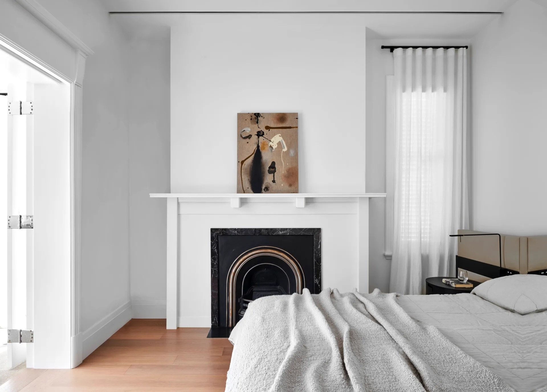 Custom bed with Society Limonta bedlinen from Ondene. Maxalto ‘Amphora’ bedside table from Space with Viabizzuno ‘Roy’ lamp from VBO. Maison Collection ‘Kobi’ linen curtains in Chalk from Homelife Furnishings. Vibrations 2 by Louise Olsen hangs above the fireplace.