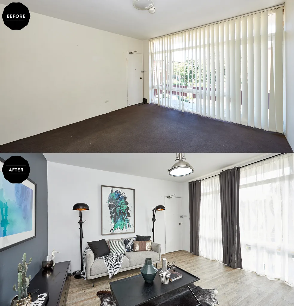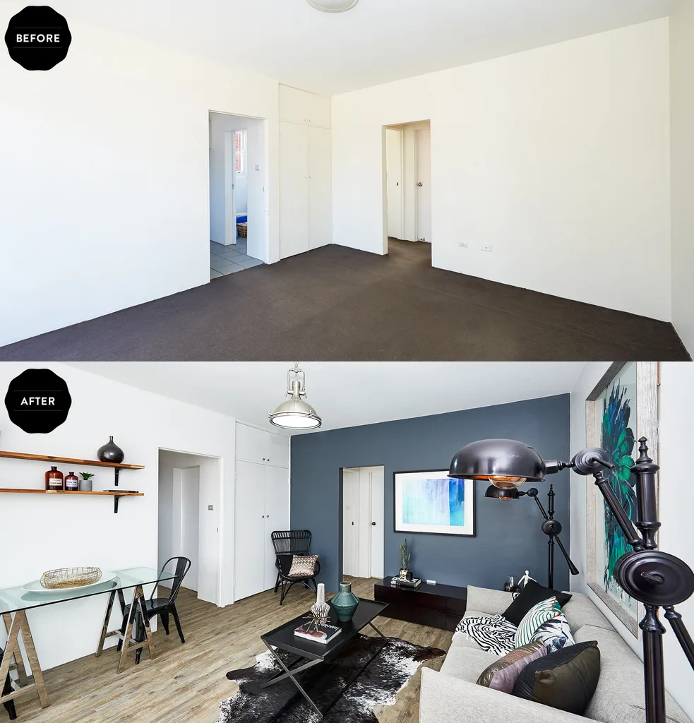 Industrial lights from Bunnings, vinyl floorboards and creative use of paint transform the living area.