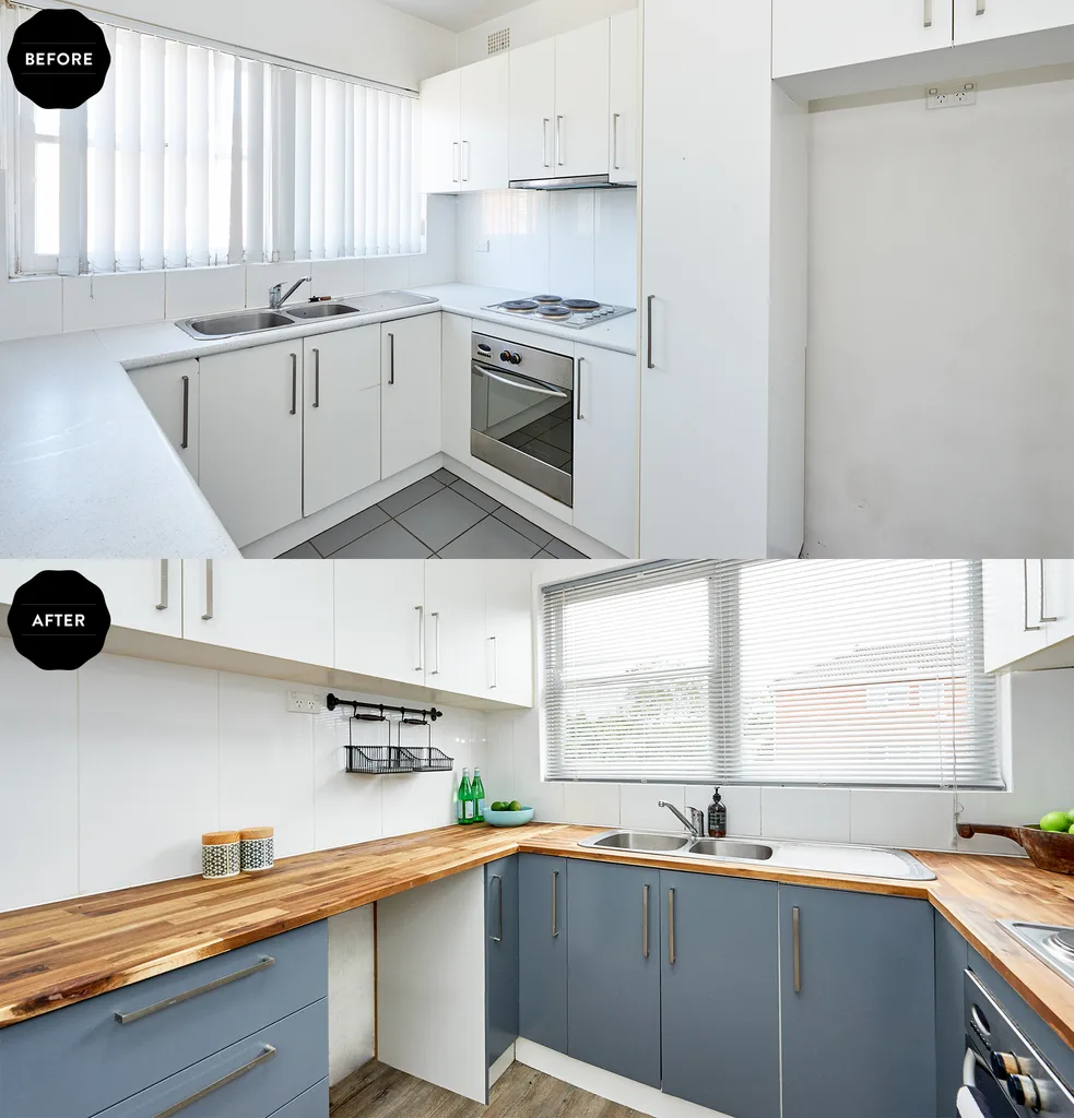 The $436 timber benchtop has totally modernised and unified this space.