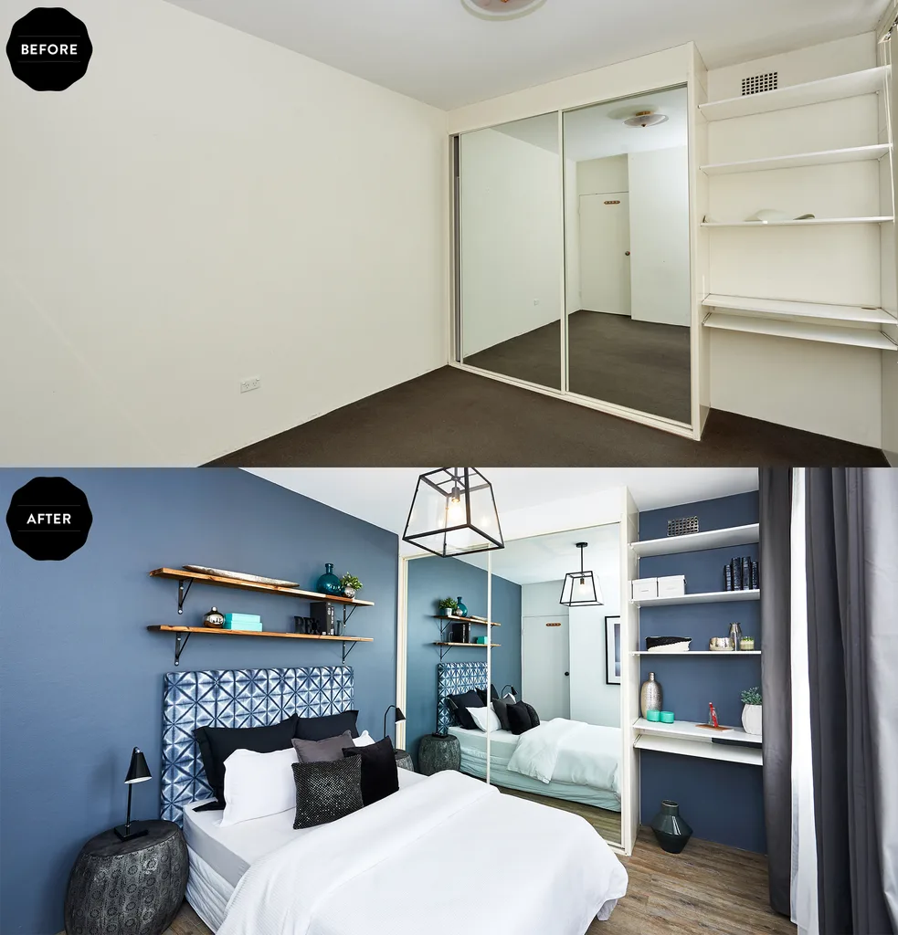 The headboard, timber shelves and bedside table add personal charm and create a strong focal point.
