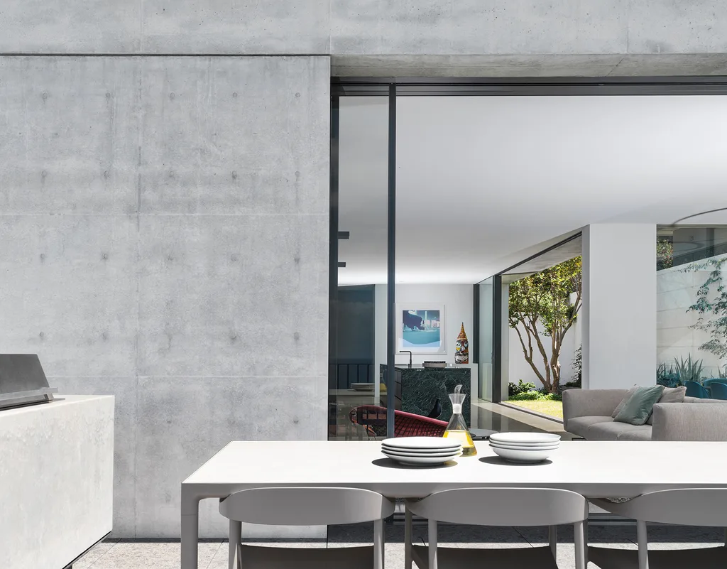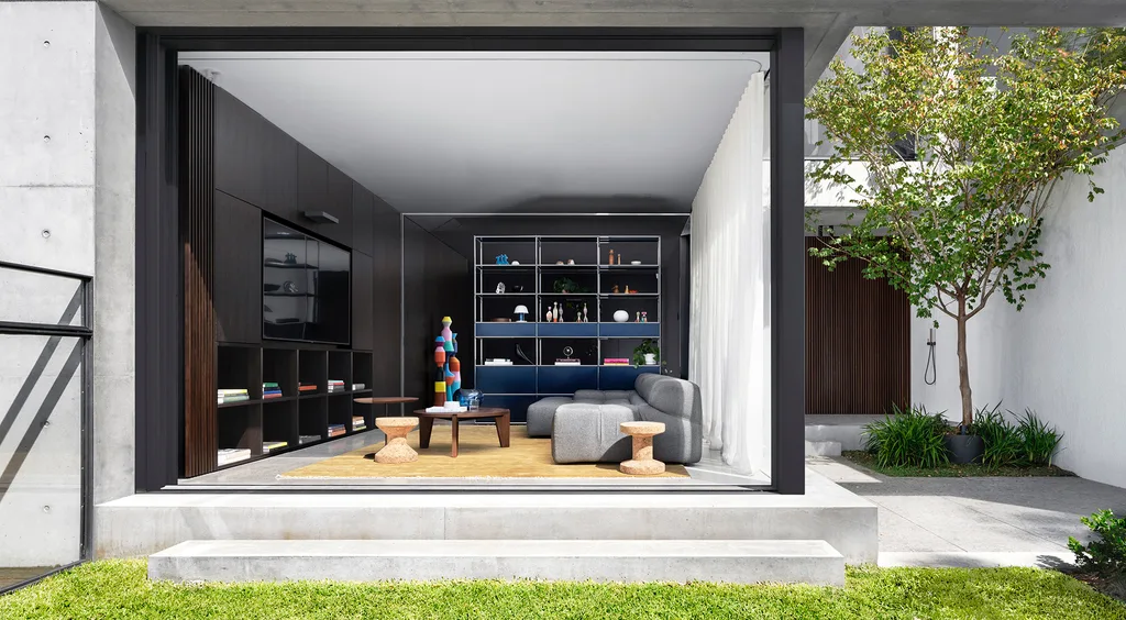 The mood of the home is definitely relaxed, and shoes off is a policy, not just a description. Matthew calls it “quiet”, with the aura of restrained luxury coming from the consistent materials palette of concrete, smoked oak timber and stippled render, as well as the selection of style-savvy furniture pieces such as USM shelving units, Knoll tables and B&B Italia seating.