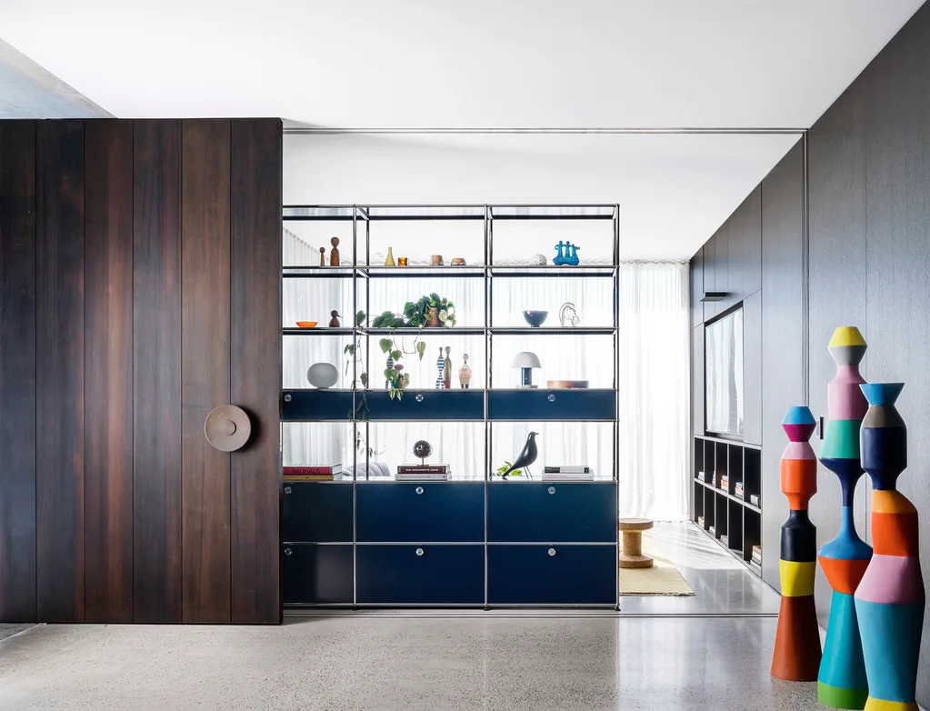 The heavy front door is in stained cedar with a custom brass handle by Tobias Partners. USM shelving unit from Anibou holds Vitra ‘Eames House Bird’, ‘Wooden Dolls’ and ‘Desk Clock’ from Living Edge. Totem artworks by Stephen Ormandy from Olsen Gallery. Smoked oak joinery.