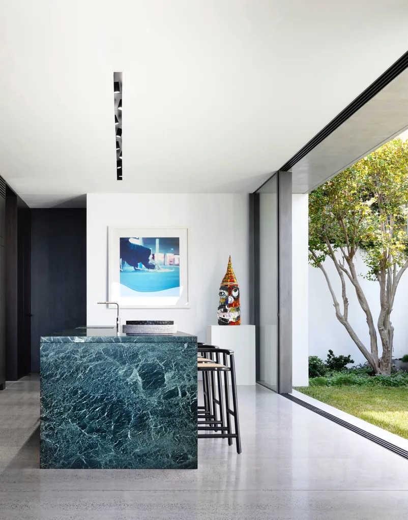 The kitchen opens to the side garden allowing a connection with the outdoors and admitting abundant natural light. Smoked oak joinery. Benchtop in Verde Tinos marble from Euro Marble. Gebrüder Thonet Vienna ‘Single Curve’ stools from Space. When Objects Work ‘HH’ bowl from Hub. Artwork is Woolloomooloo Nights by Shaun Gladwell. Sculpture is Figure with Red Crown by Ramesh Mario Nithiyendran. Polished concrete floor. Opposite page