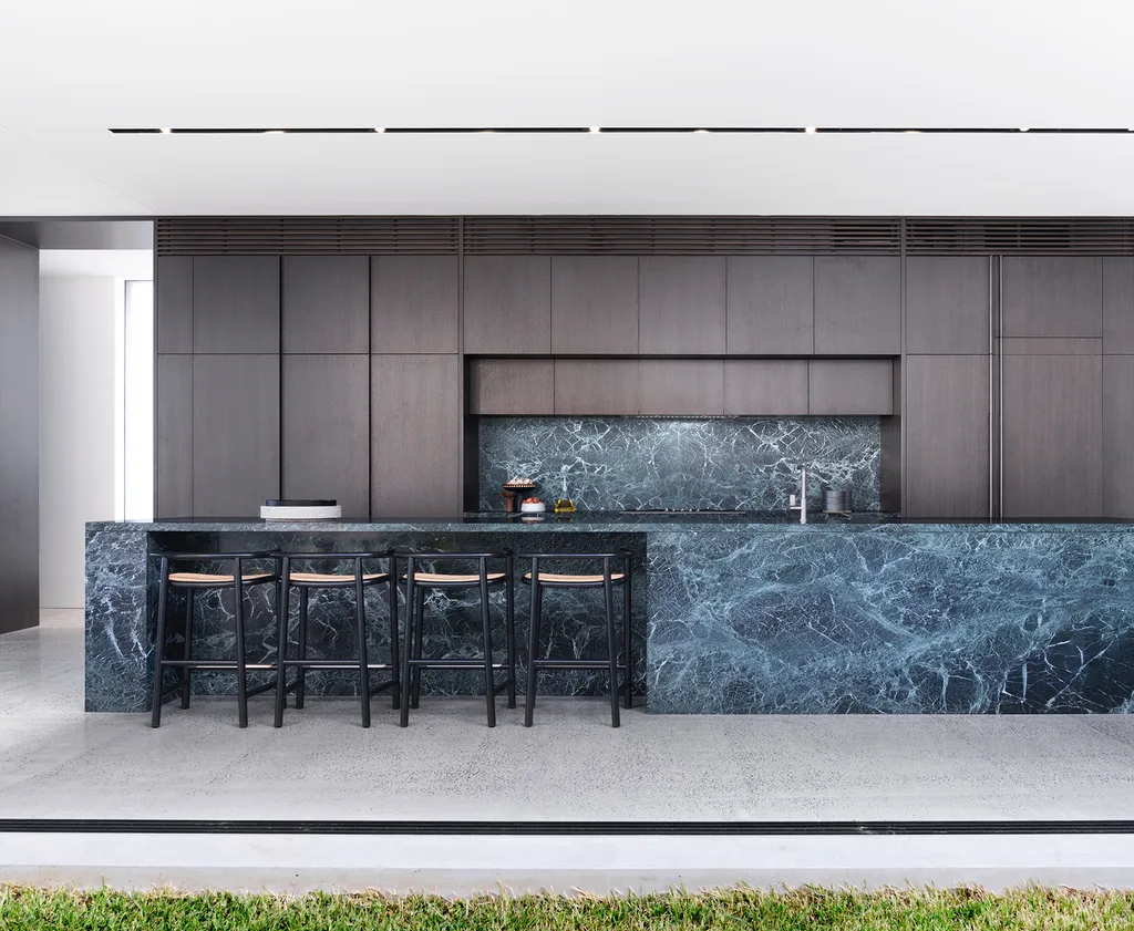 The 5.4-metre-long island bench is clad in glamorous Verde Tinos marble from Euro Marble. Smoked oak joinery. Gebrüder Thonet Vienna ‘Single Curve’ stools from Space. When Objects Work ‘HH’ bowl from Hub.