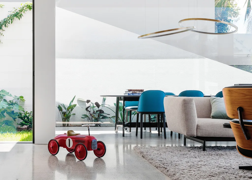 The dining area has a B&B Italia ‘Alex’ table from Space and Vitra ‘Softshell’ dining chairs from Living Edge. Viabizzuno ‘C2 Anelli’ suspension lamps. Knoll ‘Avio’ sofa and Minotti ‘Wisp’ rug, both from De De Ce. Herman Miller ‘Eames’ lounge chair from Living Edge.