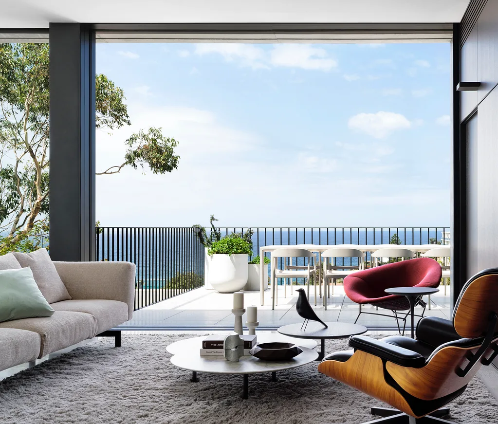 The living area enjoys panoramic views over the beach. Knoll ‘Avio’ sofa and ‘Diamond’ armchair, ‘Saarinen Tulip’ side table, ‘Grasshopper’ coffee tables, and Minotti ‘Wisp’ rug and bowl, all from De De Ce. Herman Miller ‘Eames’ lounge chair from Living Edge. Digital Organic Mineral V11 table sculpture in white marble by Stephen Ormandy from Olsen Gallery. Tribù ‘Illum’ outdoor setting from Cosh Living.