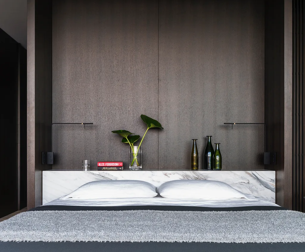 The master bed has a bedhead in Calacatta marble from Euro Marble. Viabizzuno ‘Royal Parete’ reading lights. Society Limonta throw and bed linen from Ondene.