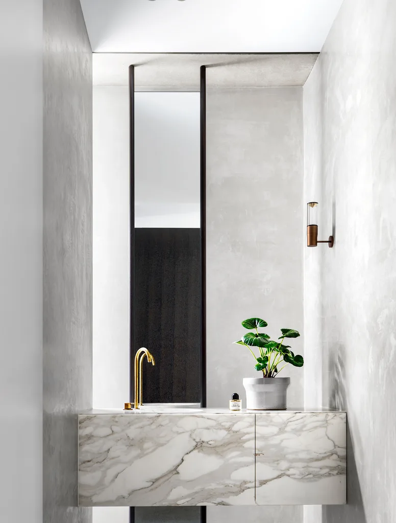 The powder room has a Calacatta marble vanity from Euro Marble with Vola tapware. Custom mirror designed by Tobias Partners. Viabizzuno ‘Royal Parete’ wall light.