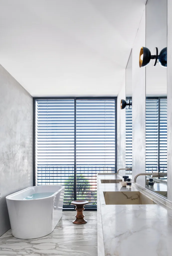 The ensuite has a Kaldewei bath from Sydney Tap and Bathroomware. Vanity and floor tiles in Calacatta marble from Euro Marble. Apparatus ‘Trapeze’ wall lights from Criteria. Herman Miller ‘Eames Walnut’ stool from Living Edge.