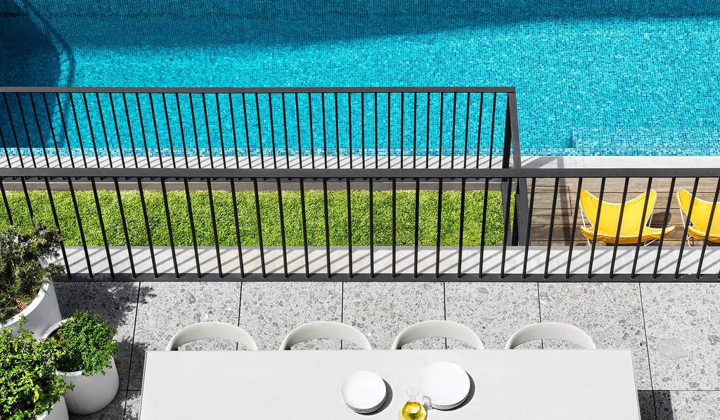 Looking down to the pool, Tribù ‘Illum’ outdoor setting from Cosh Living and butterfly chairs from Angelucci 20th Century. Pots are planted with herbs.