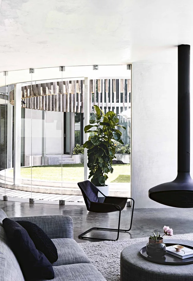 Living area The dramatic glass wall floods this space with natural light. At night, the ‘GyroFocus’ fireplace from Oblica provides warmth. A slimline Objekto ‘Paulistano’ armchair from Hub Furniture is offset by the Customweave rug, Jardan ottoman and ‘Neo’ sofa from King living, while greenery softens the concrete and glass.