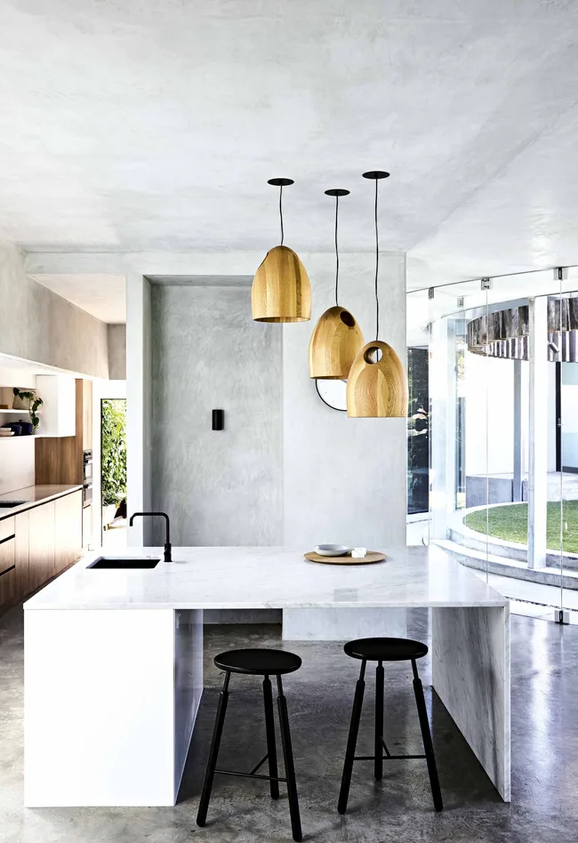 Kitchen The kitchen has been wrapped in striking feathered concrete, while the carrara marble slab from Corsi & Nicolai Australia takes centrestage, paired with ‘Raft’ stools from Great Dane. “We wanted to create a different shape, as it’s a real family meeting place,” says Mikayla. A work area, complete with pantry and fridge, is screened from the communal area.
