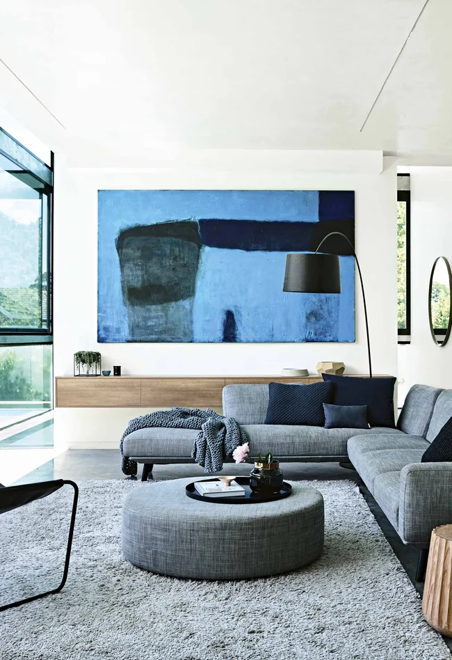 Living area The top of the glass between the living space and pool slides away – no need for a pool fence! “It’s terrific when the kids are in the pool and we’re inside,” says Steph. The TV also does a disappearing act, retracting into the ceiling when not in use. “The TV drops down at the push of a button.” ‘Emi Pod’ Stools, Anaca Studio Foscarini ‘Twiggy’ floor lamp, Space Furniture. Inax ‘Repeat Wave’ tiles, $154/sqm, Artedomus. Painting by Andrew O’Brien.