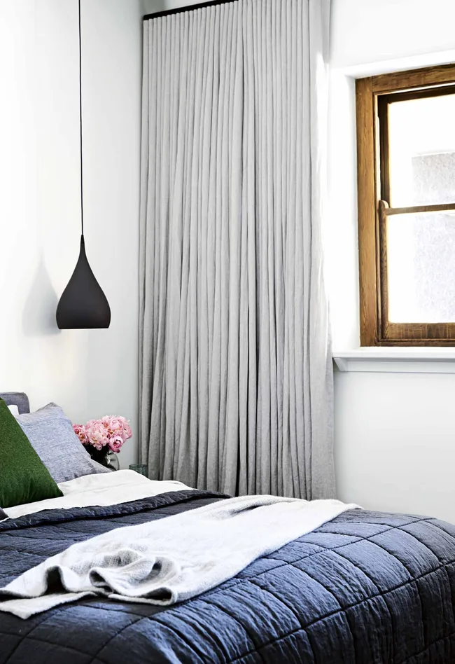 Master bedroom Contemporary curtains, soft carpets and rich timber set a luxe tone in this space. The original sash window was restored to highlight this room’s place in the original building. The dark &tradition ‘Spinning’ pendant light from Great Dane and Bemboka quilt offer a calming look. Cushions, Abode Living. Bed, King living.