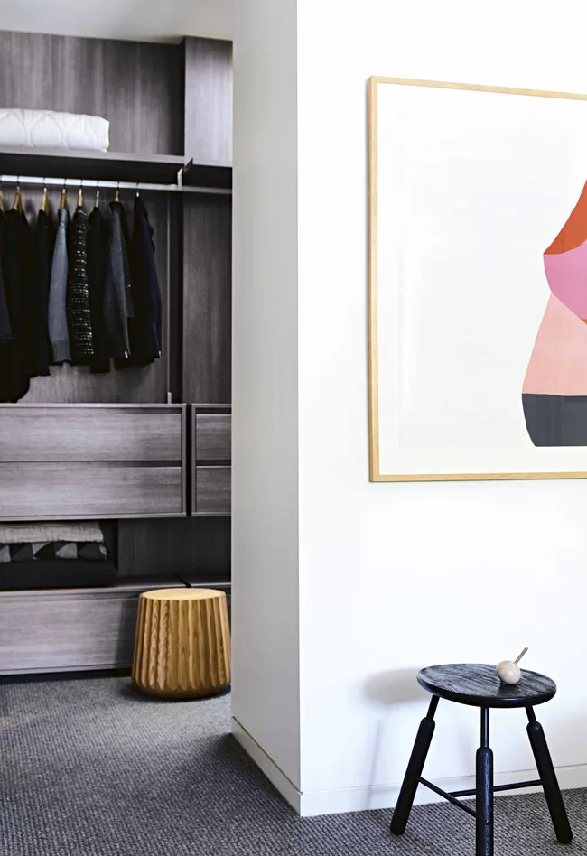 Walk-in wardrobe Cabinetry in Polytec laminate offers plenty of storage. ‘Langhorne’ carpet from Victoria Carpets continues from the bedroom to create a sense of flow. ‘Emi Pod’ Stool, Anaca Studio. Limited-edition Print by David Band.