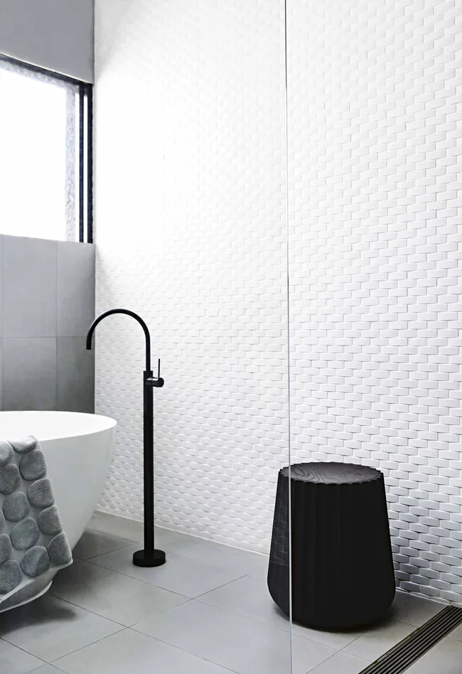 Ensuite A luxe freestanding Formoso ‘Clearwater’ tub from Reece is set off by Artedomus Inax ‘Repeat Wave’ tiles, offering a cool, fresh step away from the industrial concrete tones. The Phoenix Tapware ‘Vivid Slimline’ mixer in matt black, paired with an Anaca Studio stool, is a striking choice.