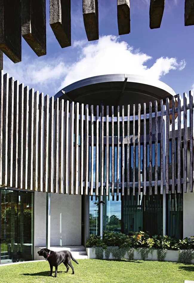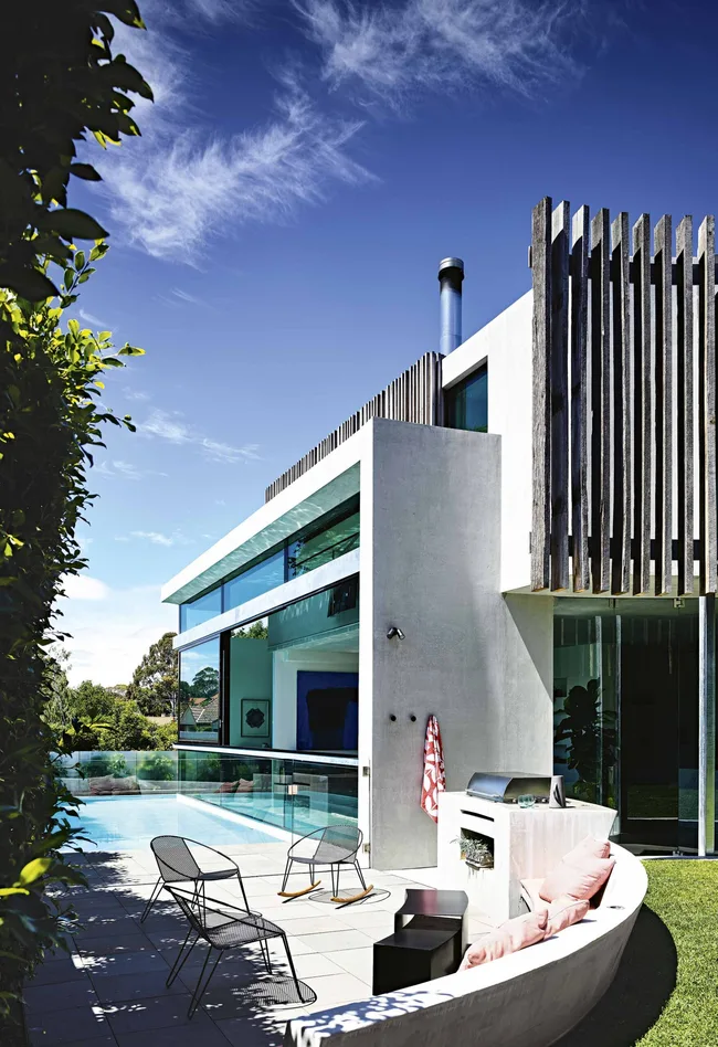 Exterior The circular shapes continue in the outside areas, where poolside lounging meets easy entertaining in the form of a built-in barbecue. Reclaimed yellow box timber panels frame the space. ‘Volley’ outdoor chairs, Tait.