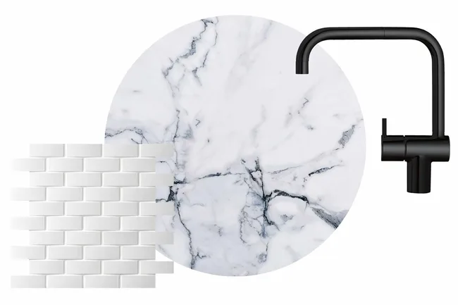 Moodboard (left to right) Inax ‘Repeat Wave’ tiles, $154/sqm, Artedomus. Carrara marble, POA, Corsi & Nicolai Australia. ‘KV1L’ mixer tap, from $1406.90, Vola.