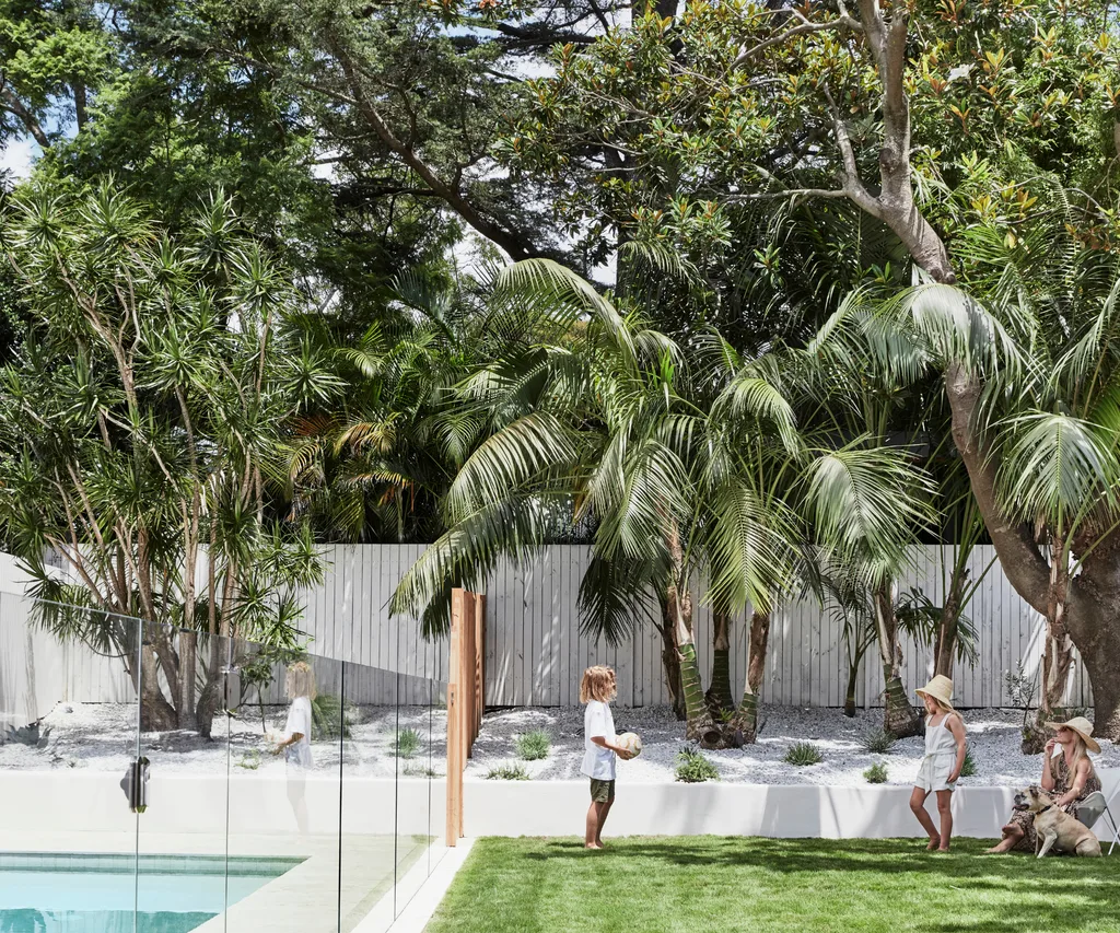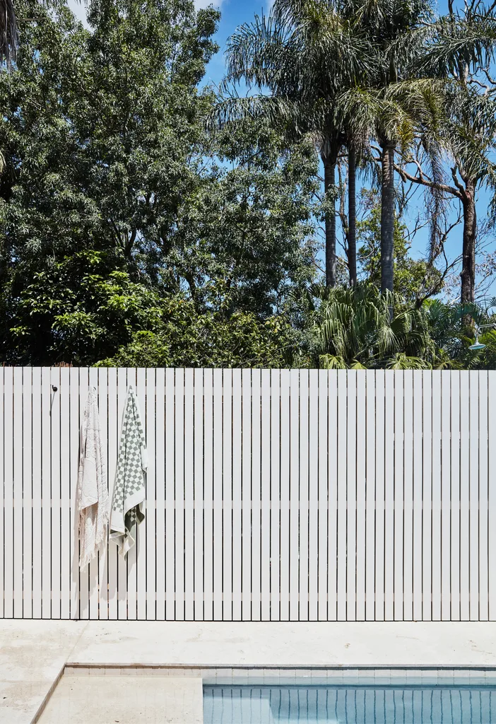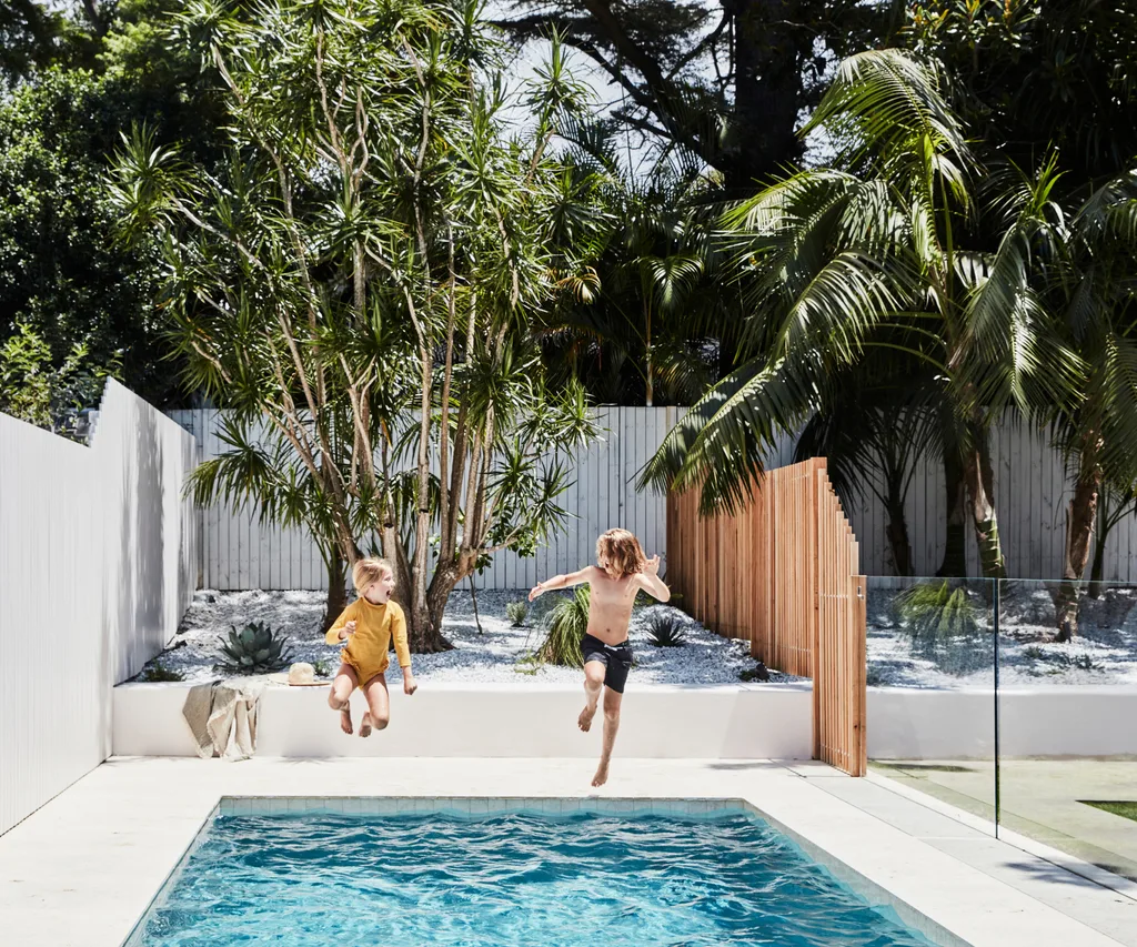 Kristin’s children Billie, 7, and Jackson, 9, delight in their newly upgraded backyard. Kristin added two styles of silver ash fencing, installed by Screening Solutions in Melbourne. The pool equipment is concealed by batten fencing that integrates into the drop edge of the pool, meeting up with the glass pool fence. The beach blanket is from Land & Sand Essentials.