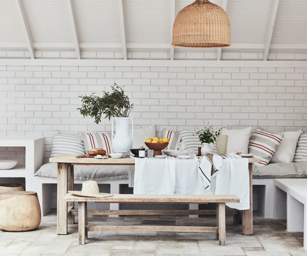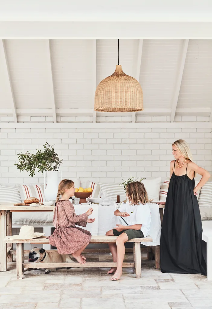 For the undercover area, Kristin selected a dining table and bench from Early Settler, pendants from GlobeWest and a white linen tablecloth from Carlotta + Gee.