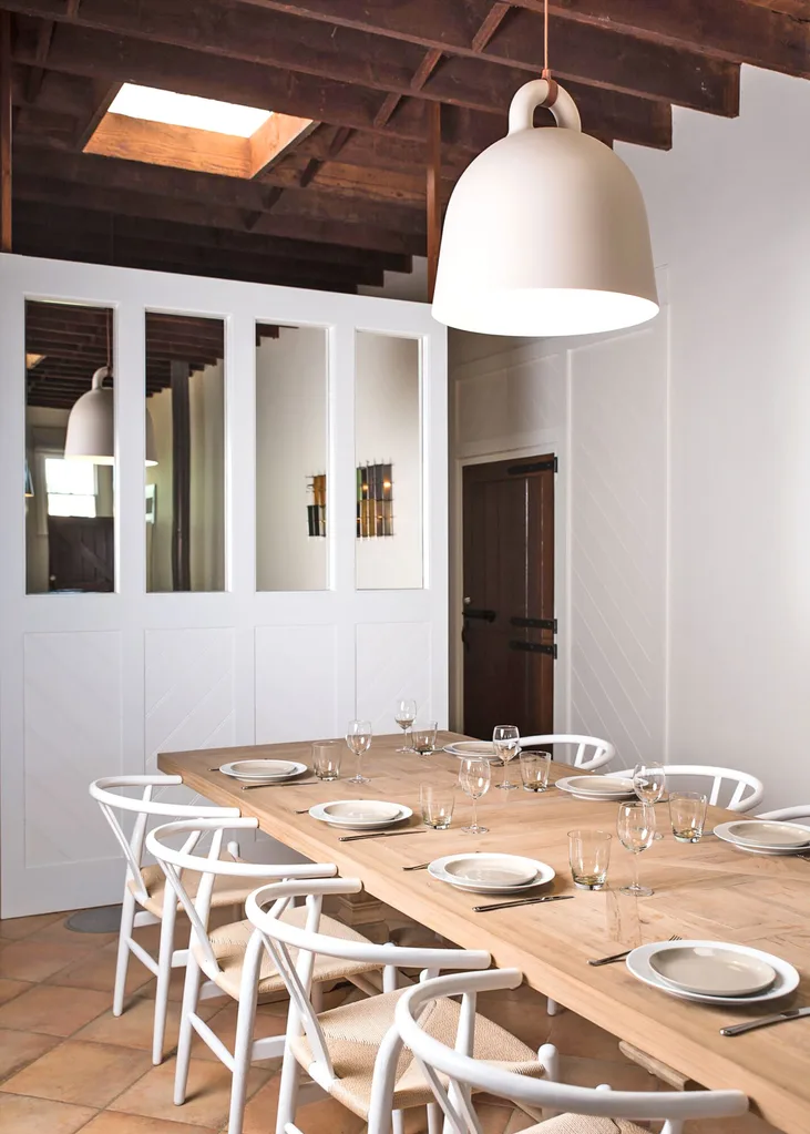 The Coach House has been decorated in a bright, contemporary style. A ‘Bell’ pendant light by Normann Copenhagen hangs above the dining table.