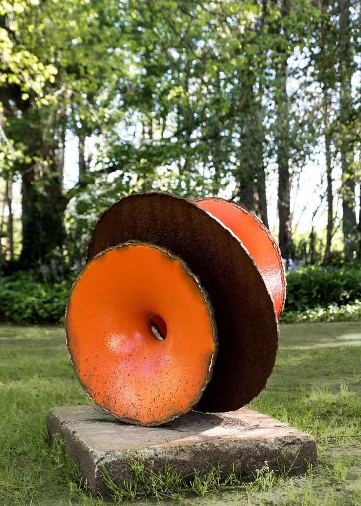 This sculpture ‘Cast Iron Conversion (Orange)’ – one of many in the garden – is by James Angus.