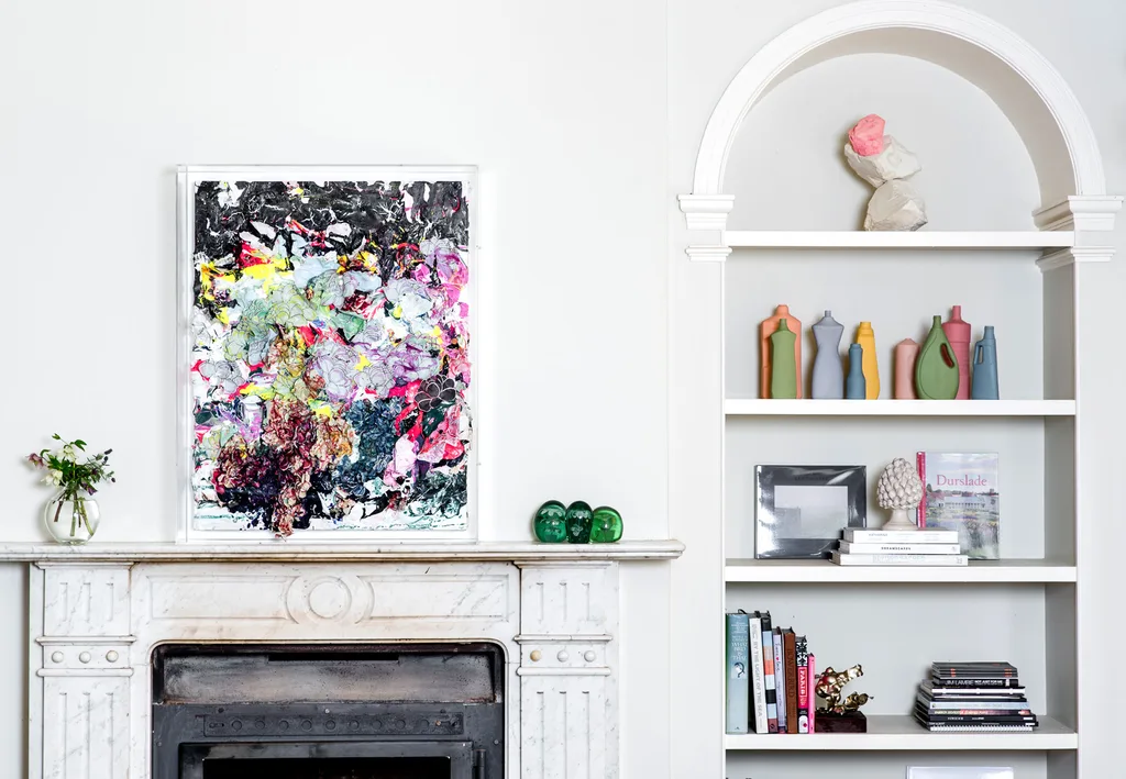 The homestead’s 19th Century heritage is visible with an arched shelf and grand, marble fireplace. On the mantle is an artwork by Zhuang Hong-Yi. The colourful ceramics on the shelf are by MK Porcelain.