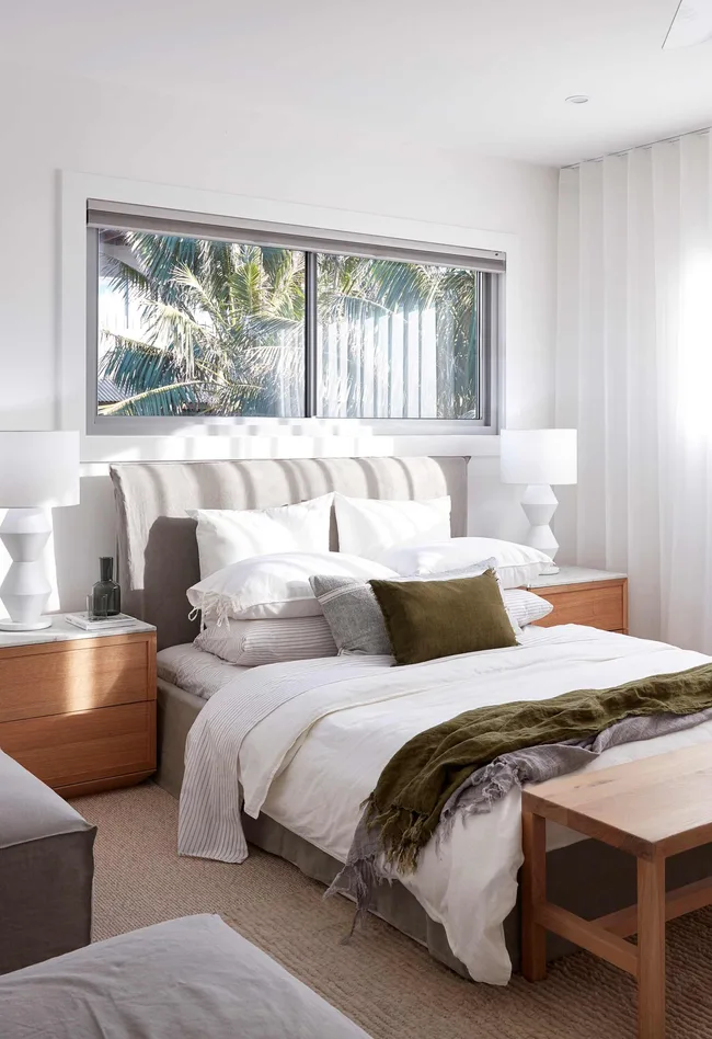 In this bedroom Neale paired ocean-toned bedding with timber tones to create a luxurious look.