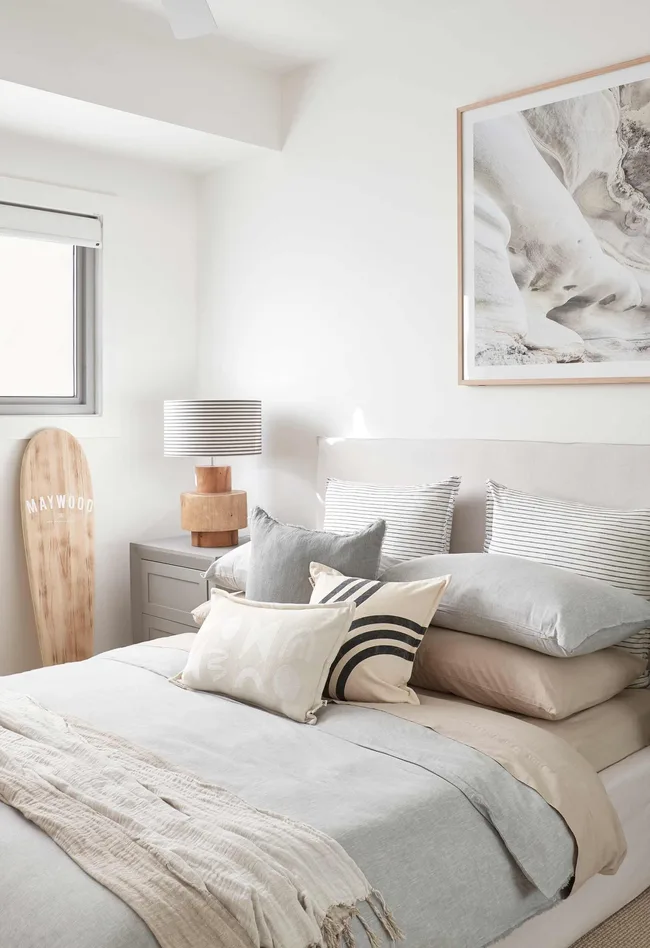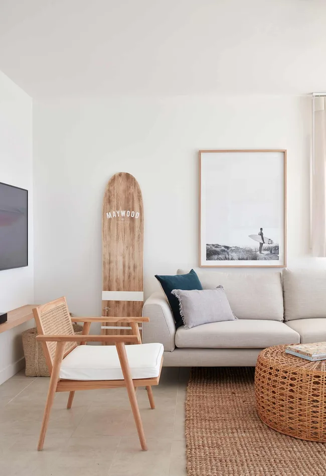 Neale added a statement surfboard to the living room decor, effortlessly evoking the beach.
