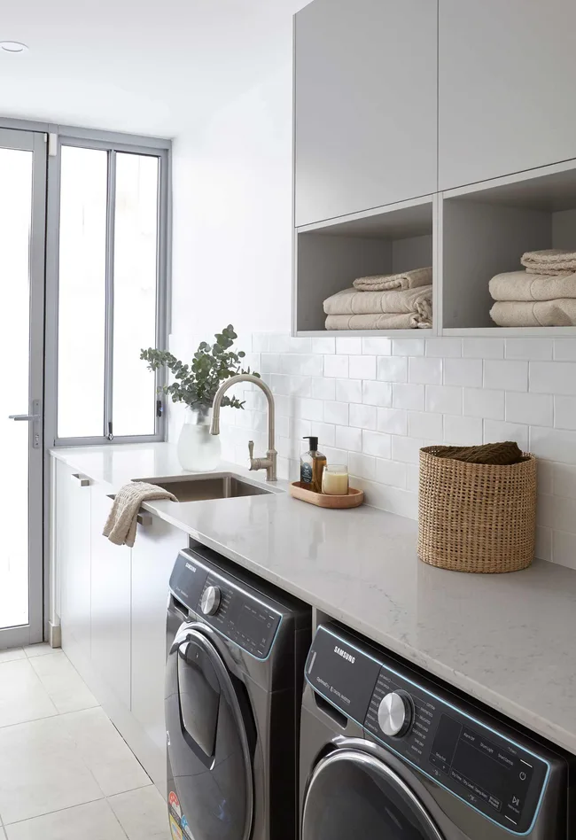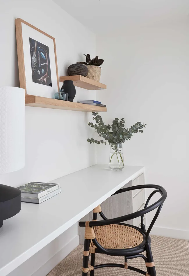 The timber and white palette runs throughout the home, with pops of rattan and a tactile sisal rug in the dining area providing warm contrast.