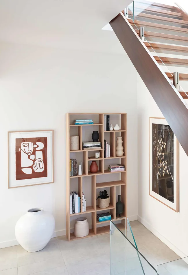 The stairwell has been transformed into a chic nook, courtesy of a beautifully styled display shelf.