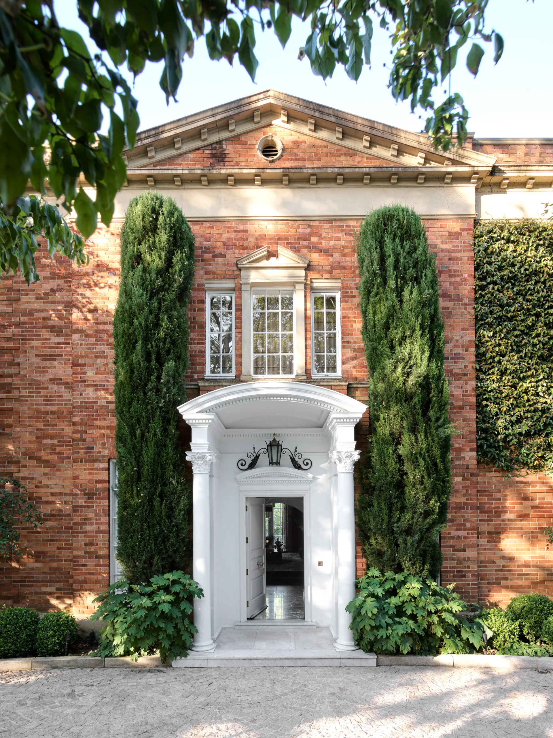 The handsome Georgian Revival facade with pillars and portico strongly hints at the grandeur beyond.