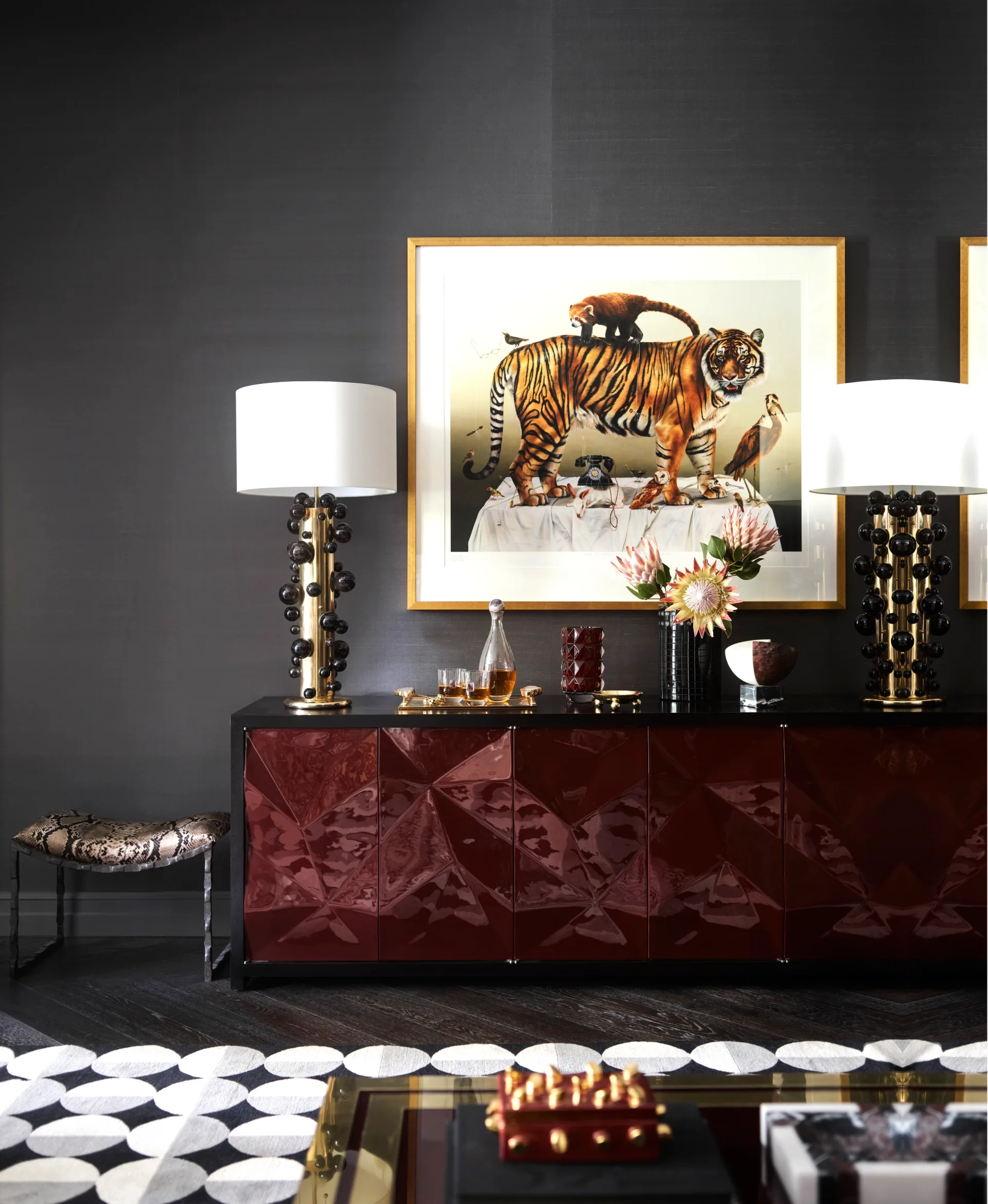 In a corner of the living room, lamps from 1stDibs. Bolier cabinet re-lacquered in Burgundy from Studio Cavit, with Baccarat ‘Louxor’ crystal vase from Palmer & Penn, and ‘Boule’ brass bowl, ‘Beta’ ice bucket and ‘Fleur’ marble sculpture, all from Greg Natale. Kate Bergin artwork. Porta Romana ‘Giacometti’ stool covered in snakeskin fabric from South Pacific Fabrics.
