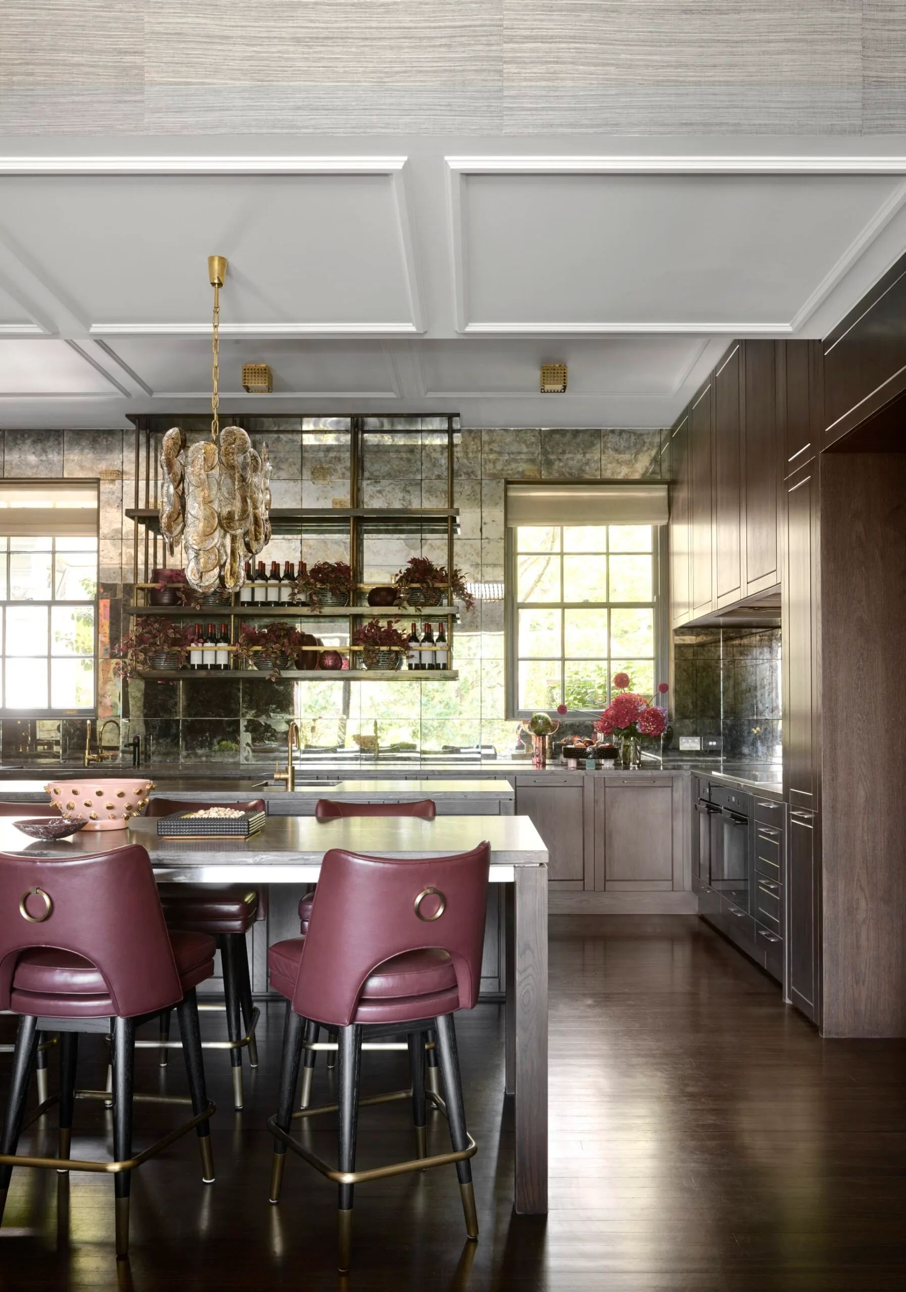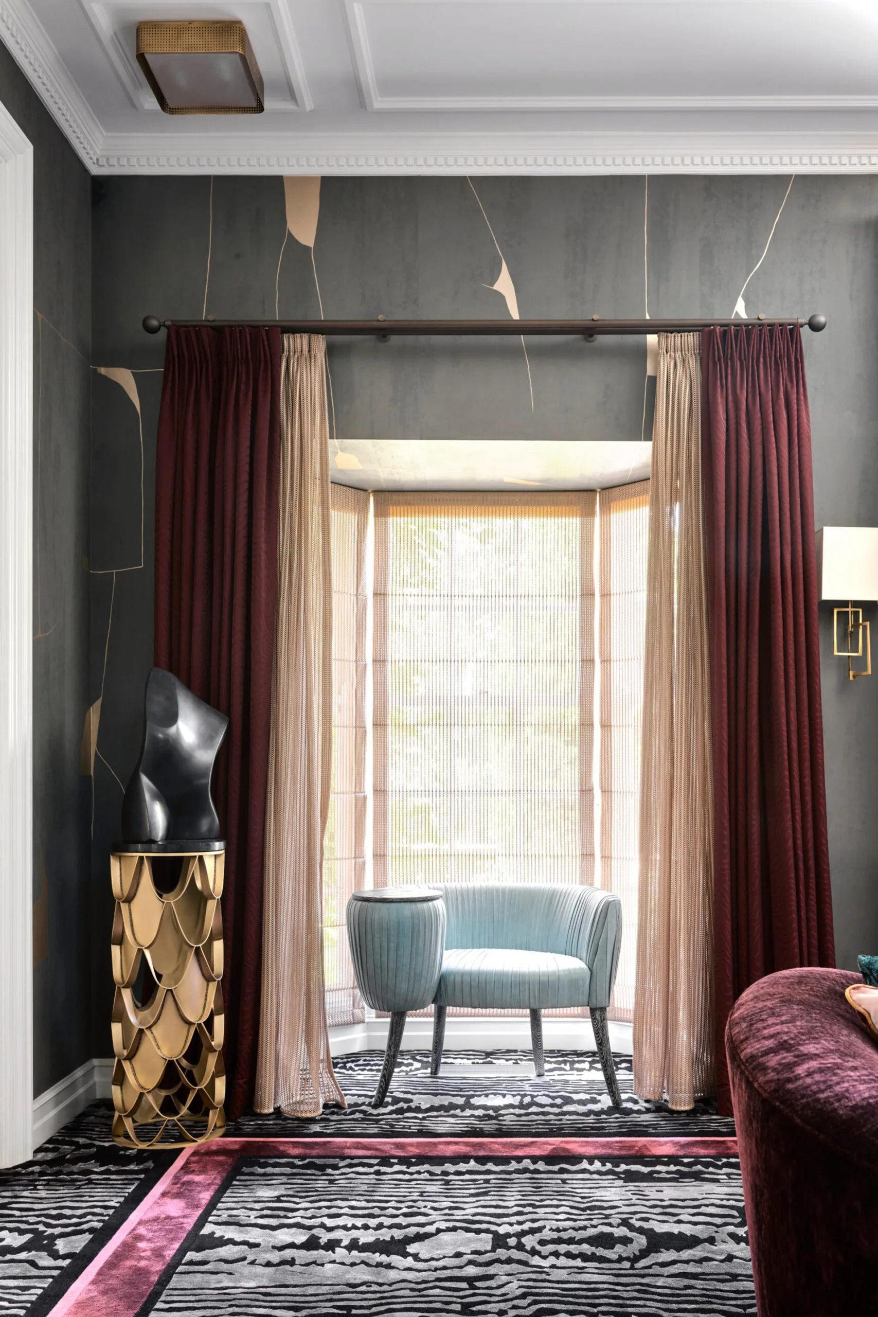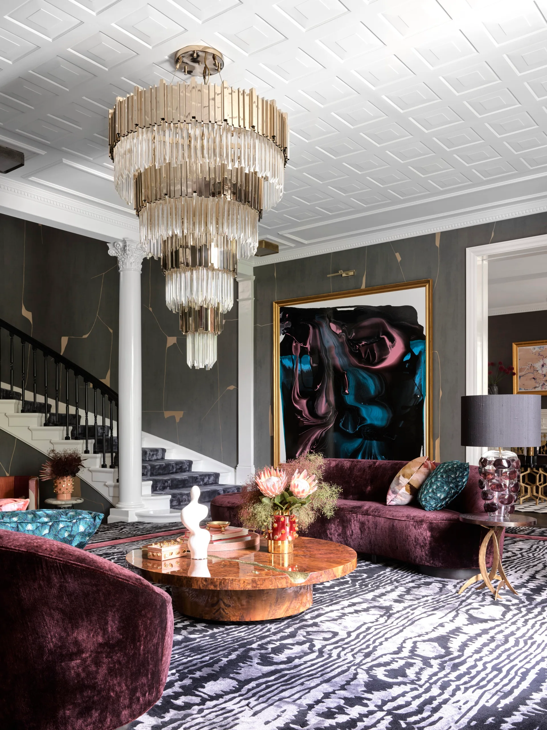 So lavish is the new entry area that it now becomes the formal living room, complete with burgundy Vladimir Kagan ‘Serpentine’ left and right sofas from Holly Hunt. Boca Do Lobo ‘Empire’ centre table in walnut from Covet House with ‘Liza’ box and vase from Greg Natale. ‘Empire’ chandelier from Luxxu. Painting by Dale Frank. ‘Moire’ rug by Greg Natale from Designer Rugs. ‘Blob’ hand-blown glass lamp on ‘Miro’ console side table with glass top, both from Porta Romana. ‘Kintsugi’ wallpaper from Porter Teleo.