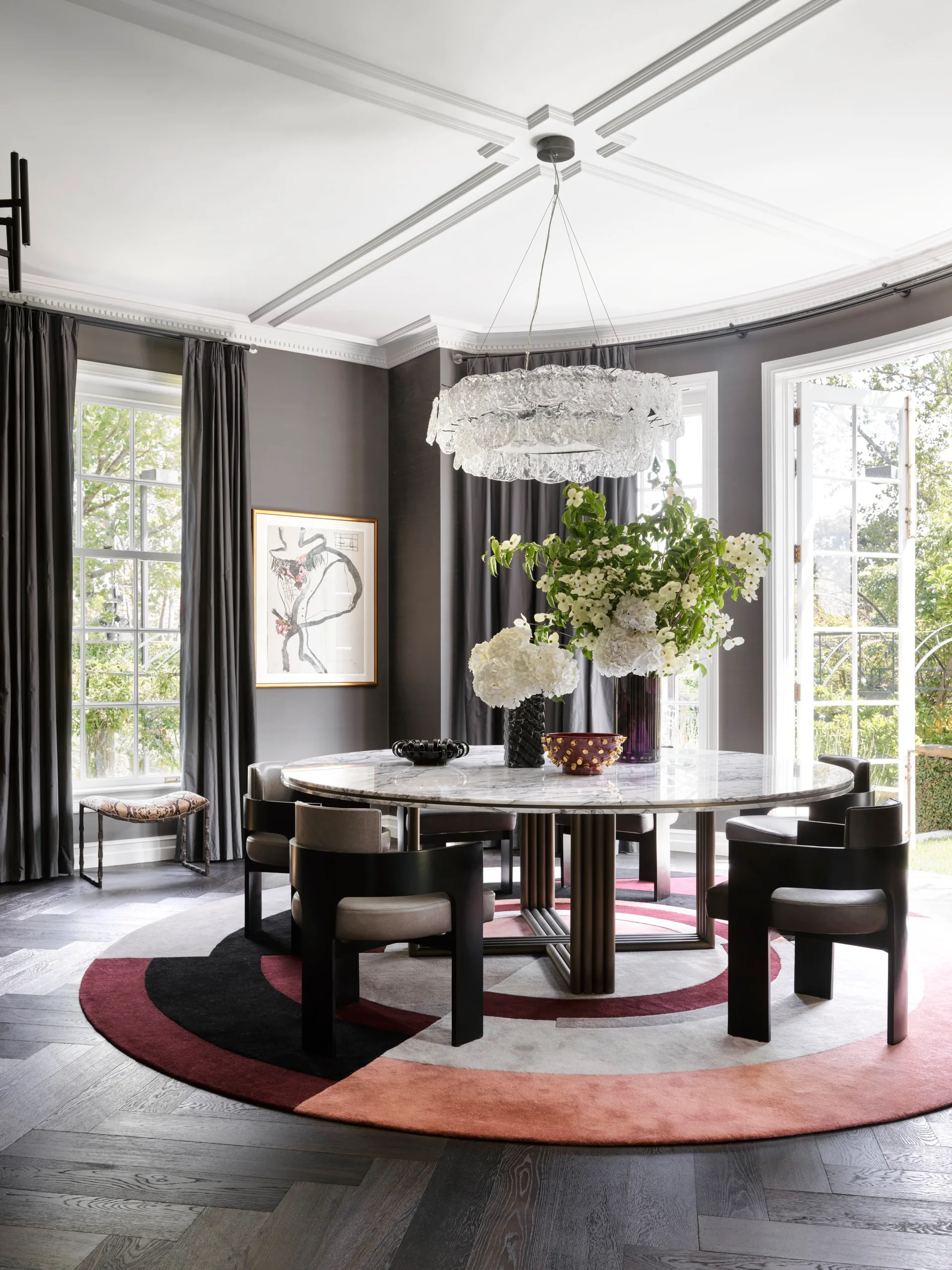 Greg relocated the formal dining room to free up the previous space for a children’s playroom, essential for a family with six children. Dining table custom made by Greg Natale with dining chairs from Kelly Wearstler. Grey silk wallpaper, ‘Apollo’ vase crystal in Amethyst, ‘Dante’ vase in Nero, ‘Liza’ bowl in Maroon and ‘Despres’ rug, all from Greg Natale. Artwork by John Olsen. ‘Rock Edge’ chandelier by John Pomp from A Rudin.